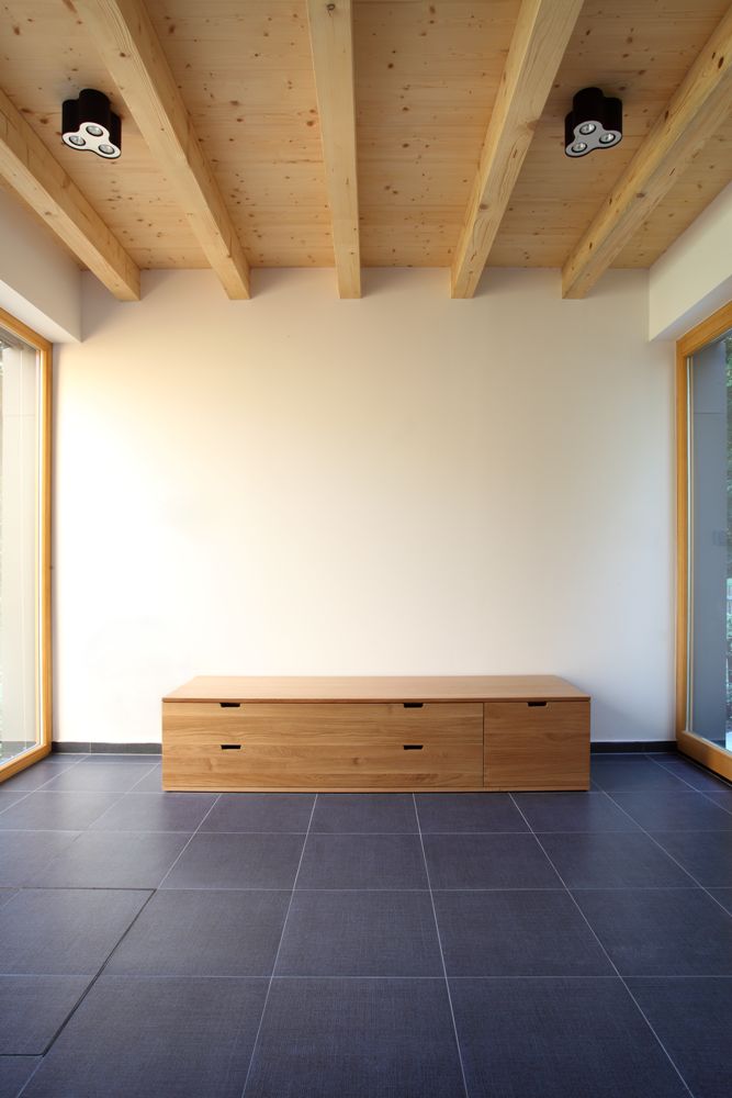 De la cabana originală doar soclul din piatră a fost păstrat,devenind bază pentru casa noua,care a fost concepută pe o structură din lemn Ferestrele sunt orientate parţial la nord (spre drumul de acces), dar mai ales la sud (spre râu). Acest lucru protejează viaţa privată a clientului de casele din apropiere şi oferă, de asemenea, o vedere uimitoare spre râu.