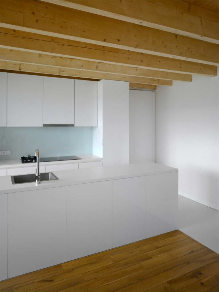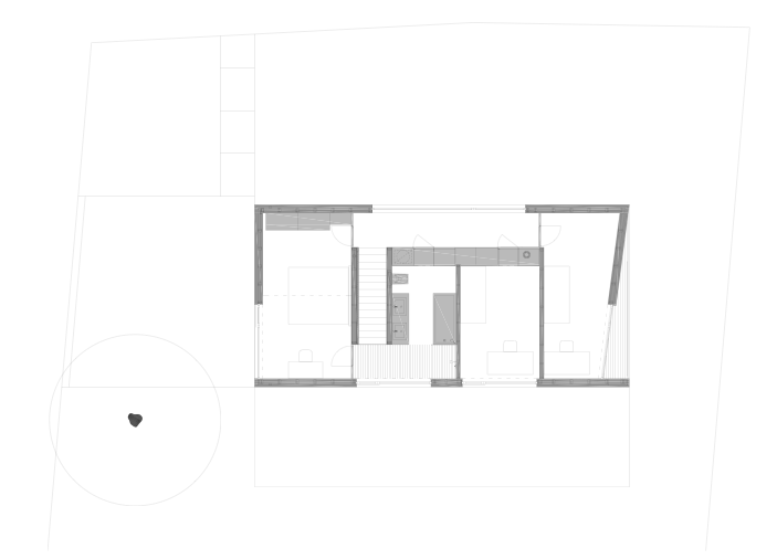Parterul este dominat de livingul principal, cu o bucătărie separată de zona accesului prin volumul scării ce leagă cele două nivele. Etajul superior (mansarda) este împărţit în secţiuni mai mici: trei dormitoare şi o baie.Coridorul de la mansardă,are pe o latură o zonă de depozitare-dulap în perete. În plus faţă de dormitorul principal, ce prezintă un confort ridicat cu acces direct la baie, toate celelalte camere de la mansardă sunt acoperite cu un tavan plat ,astfel se crează un pod mic utilizabil deasupra lor.