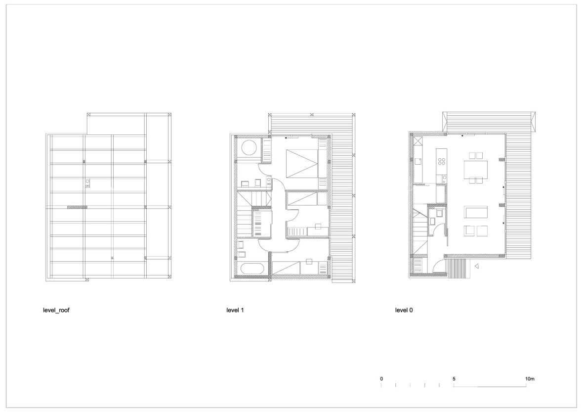 Parterul e compus din living şi bucătărie cu spaţiu pentru depozitare.Livingul are posibilitatea de a se transforma în cameră pentru musafiri sau zonă de lucru.Zona de zi se deschide spre o terasă înălţată şi o grădină de mici dimensiuni.