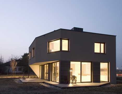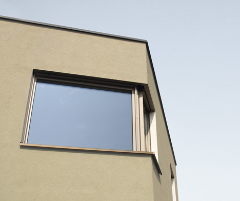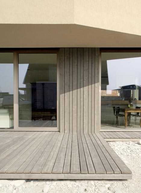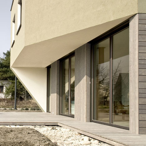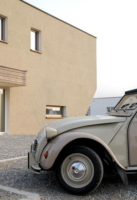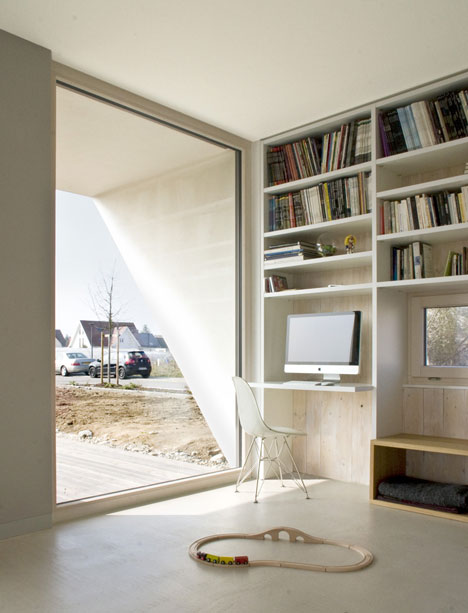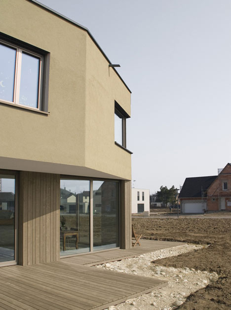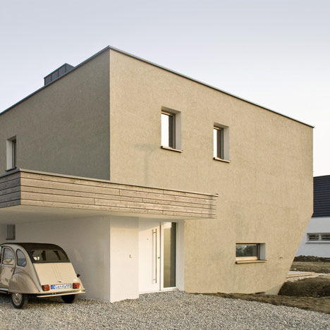 Faţada acestei case unifamiliale ,realizată lângăBaselde către arhitecţii elveţieni andOFFICE , se retrage spre interior pentru a încadra şi pune în valoare o terasă din lemn.