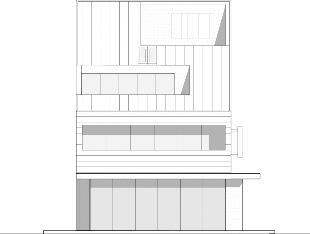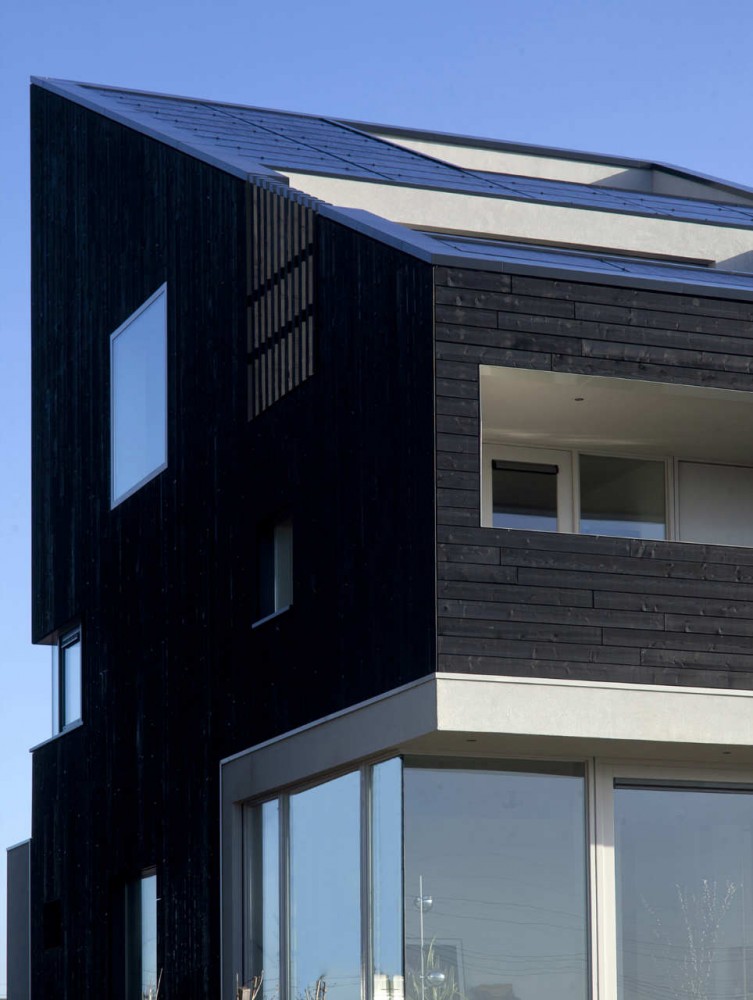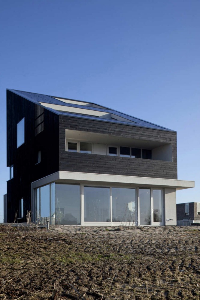 Partea superioară a clădirii este realizată din lamele de lemn închise la culoare în timp ce baza de la nivelul parterului este albă.Pe zona înclinată a acoperişului sunt montate panouri solare ce sunt vizibile din parcul de peste apă.