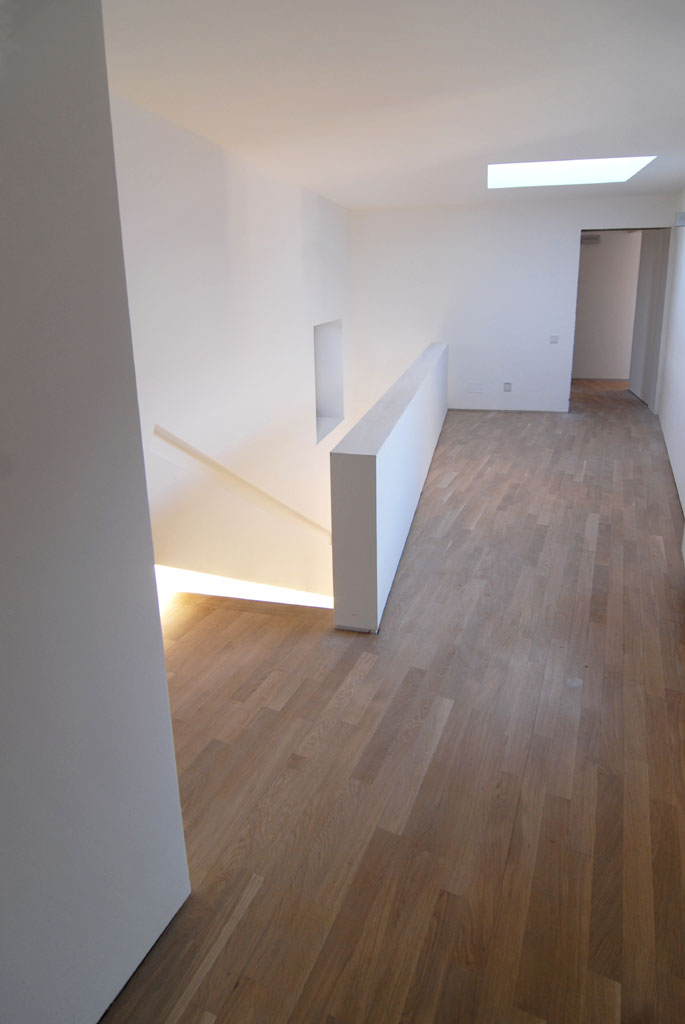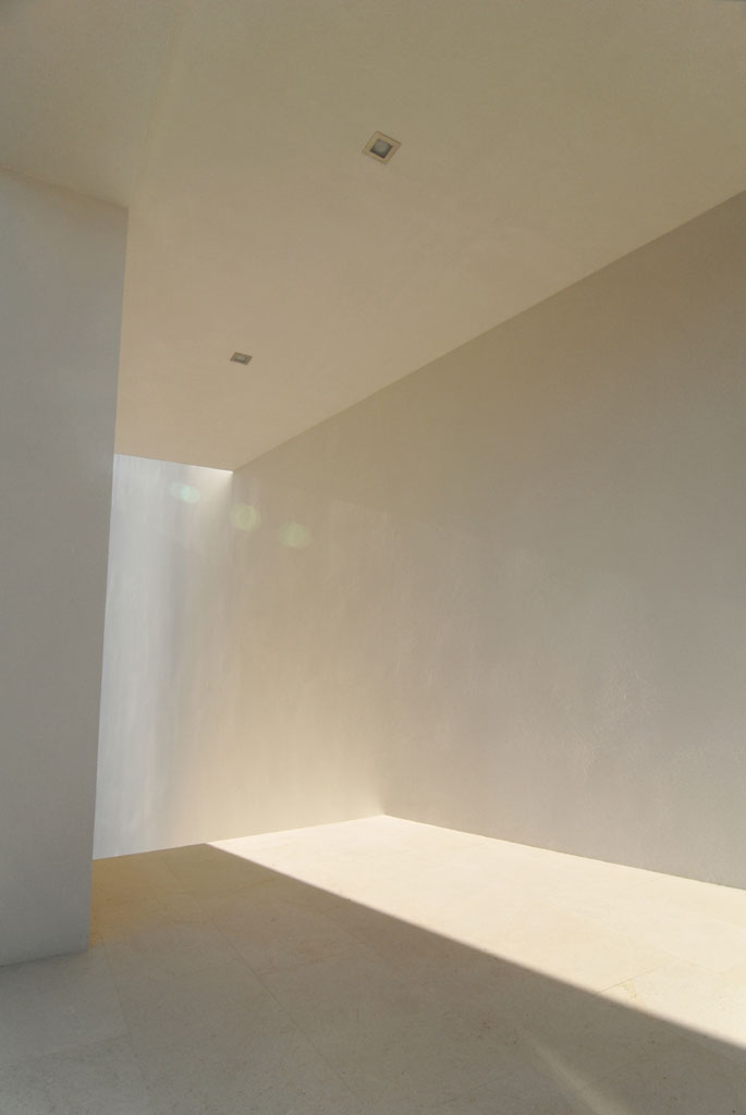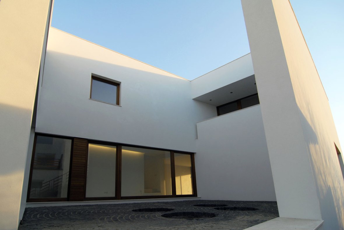 Casa ce pare din exterior un volum solid si inchis, ofera- odata ce ai patruns in spatiul interior- dezvaluirea rand pe rand a catorva elemente surprinzatoare. Dincolo de zidurile exterioare poti descoperi prezenta radianta a curtii interioare ce nu se lasa relevata aproape deloc din curtea exterioara a casei. La etaj, se face simtit un fascicul zenital din directia luminatorului ce are aceleasi dimensiuni cu toate celalalte goluri patrate de pe fatade. Luminatorul, prin pozitionarea sa in zona comuna de intersectie a celor doua volume ale casei si prin unicitate devine un fel de punct nodal al casei sub care, odata ajuns se cere o secunda de repaus.