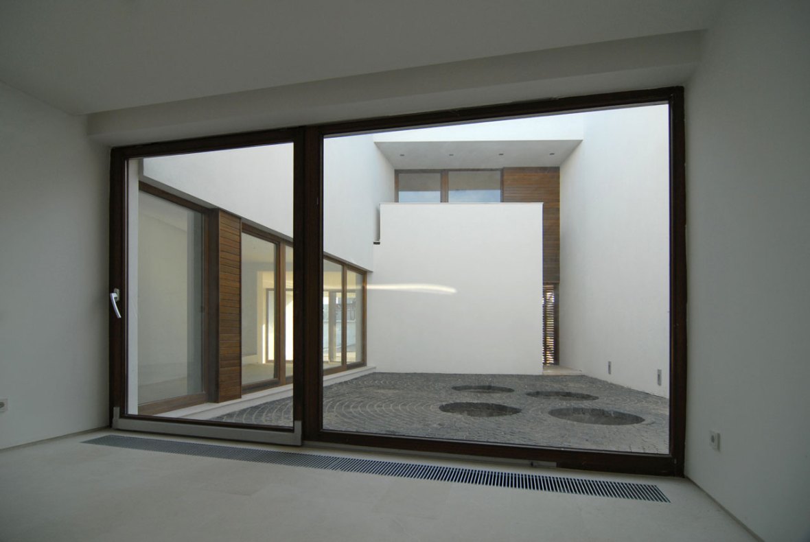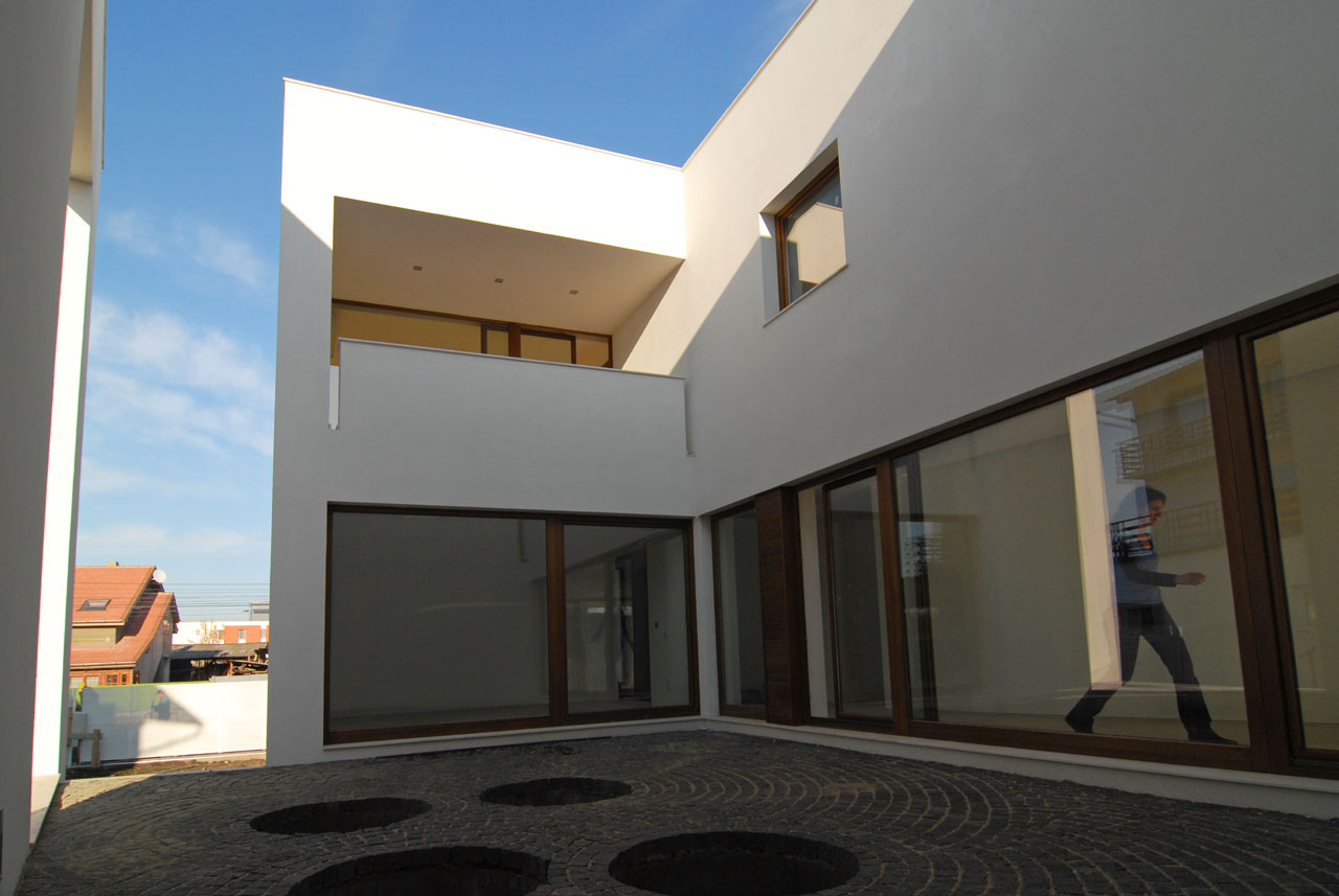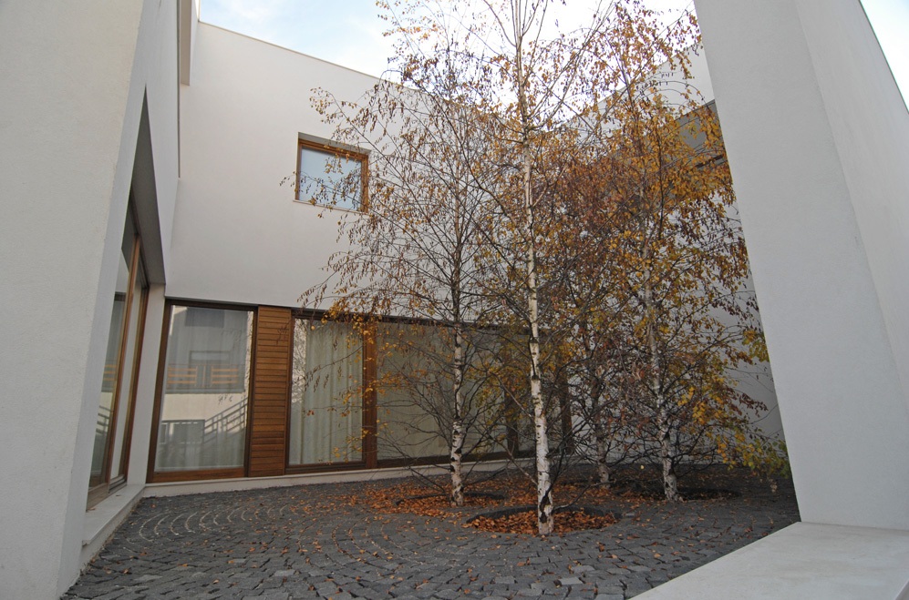 Volumul casei inchide in centrul sau o curte interioara catre care sunt orientate spatiile casei ce pretind o anumita intimitate. Curtea interioara comunica cu restul spatiului exterior printr-o mare “fereastra” in cadrul careia trebuia sa se decupeze silueta unui nuc ce exista pe sit in momentul de debut al proiectului. Pe timpul santierului insa, lucrarile mecanizate au distrus nucul, astfel incat astazi, marea “fereastra” incadreaza in mod ironic- cel putin pana la formarea coroanei copacului nou plantat -chiar unul dintre elementele satirice ale casei invecinate.