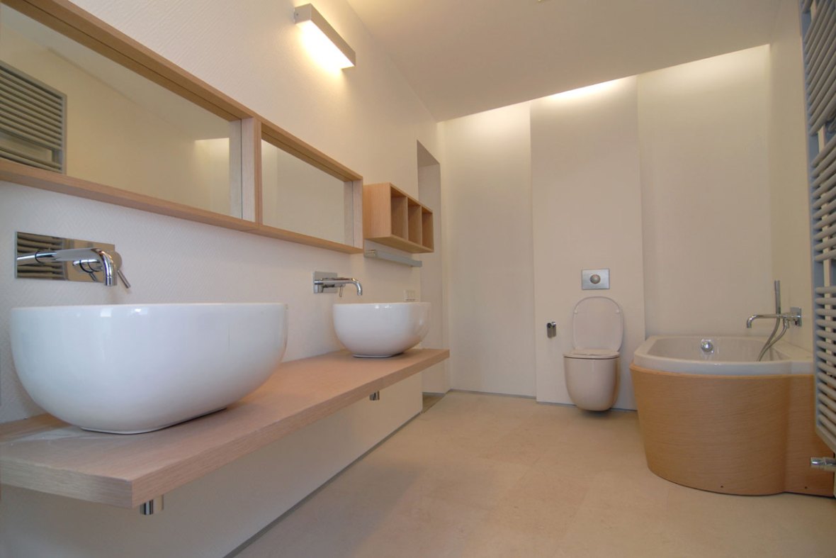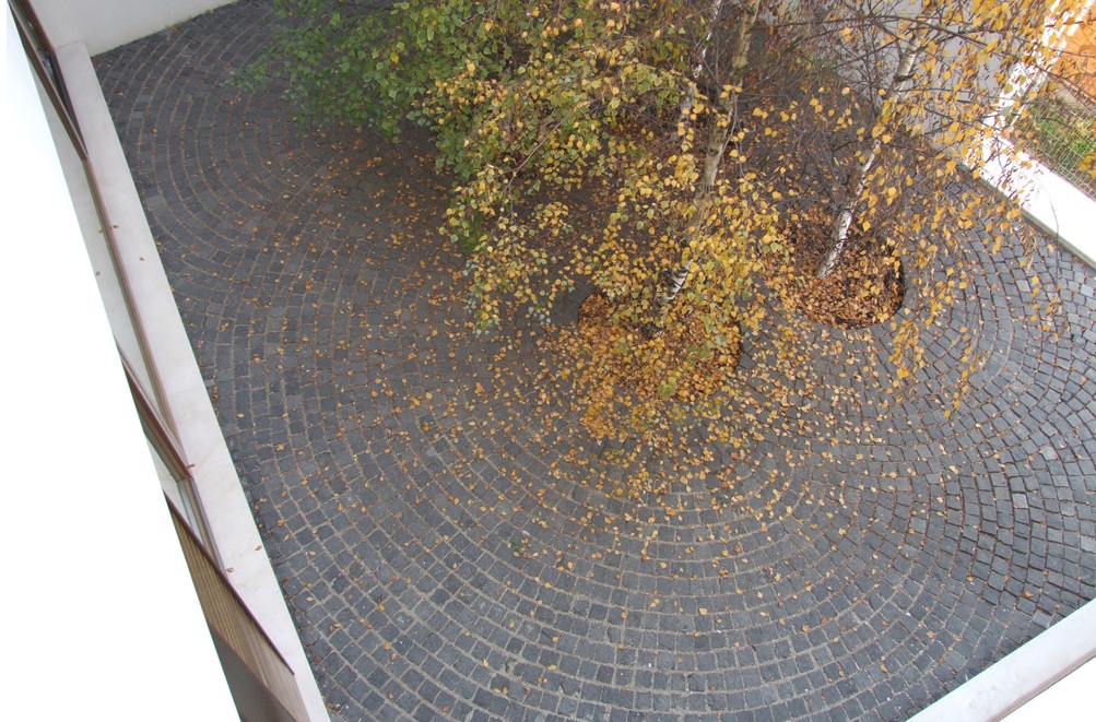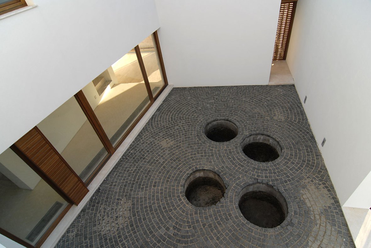 Pentru ca pardoseala curtii interioare devine pentru privitorul de la etaj un element definitoriu al acesteia, pavajul din piatra cubica se aseaza in cercuri concentrice, dupa o regula organica complet diferita fata de cea care modeleaza spatiile casei. La un alt nivel de perceptie, ce implica si simtul tactil, se mai face inca o diferentiere. Pe peretii netezi si albi ai casei, doar in spatiul bailor s-a aplicat tapet acoperit cu latex alb, avand insa tesaturi diferite in functie de destinatarul baii.