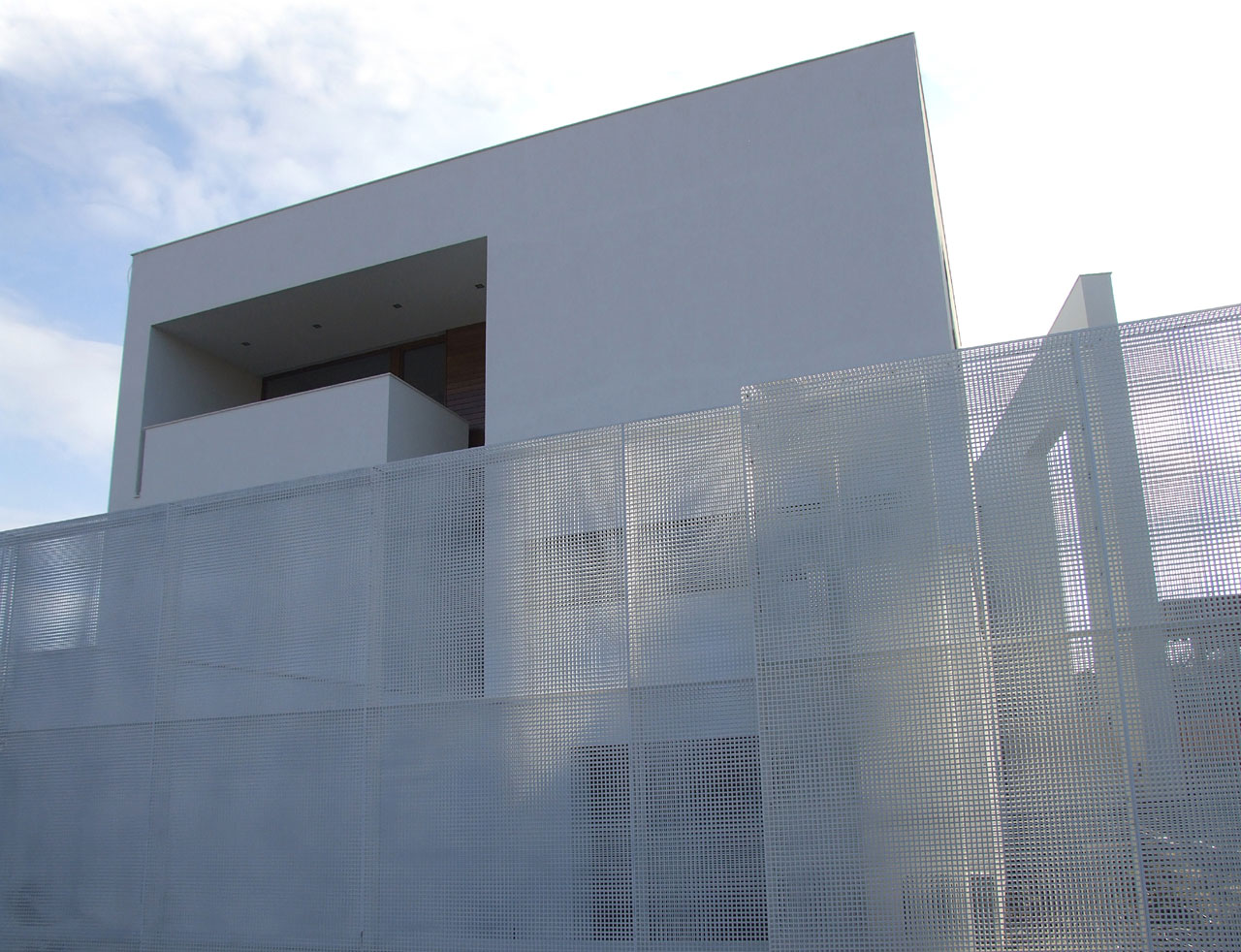 Tema luminii modulate si filtrate este preluata inca o data in plus la nivelul imprejmuirii catre strada care, fiind formata din doua foi suprapuse de tabla perforata alba -reuseste sa formeze un filtru iluzoriu transparent, dar cu efect halucinant asupra privitorului dinspre strada.