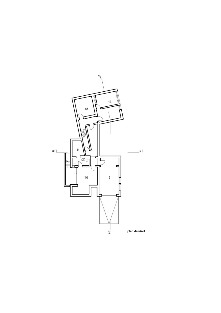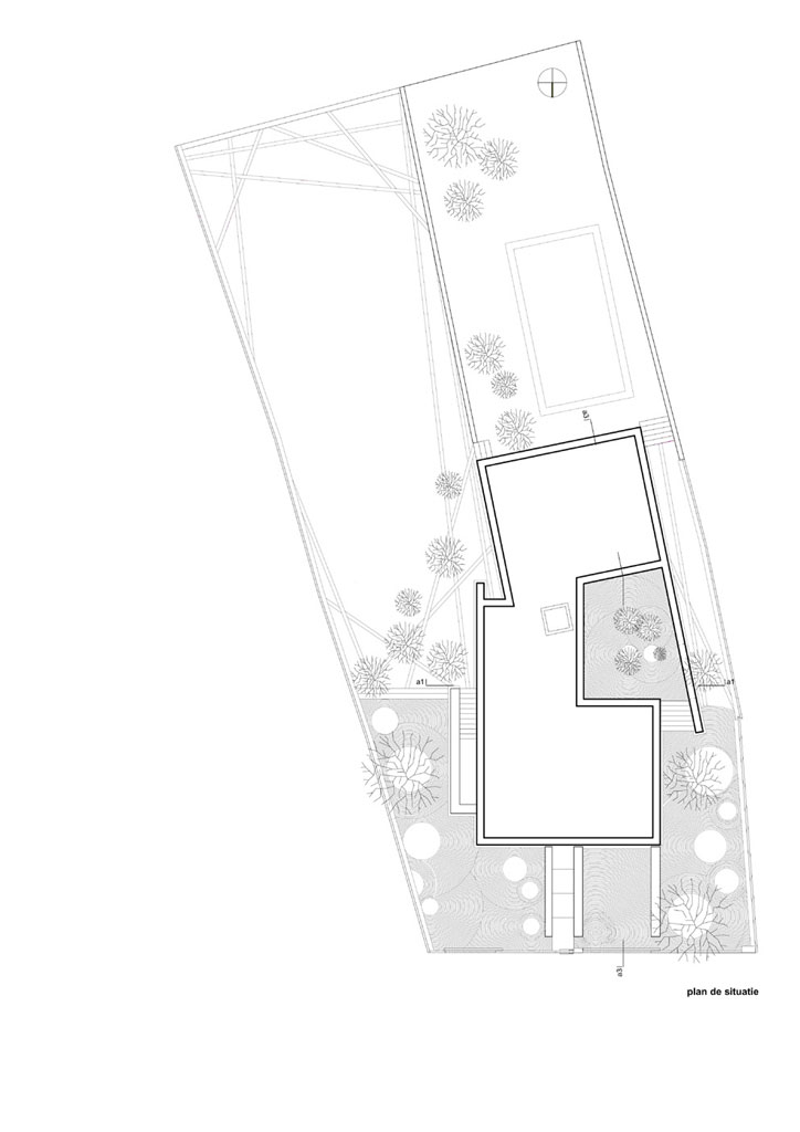 Solutia proiectului a fost modelata atat de forma neregulata a parcelei cat si de vecinatatile eterogene. Unghiul de inflexiune al terenului a facut ca cele doua volume majore ale corpului casei sa se articuleze in acelasi mod, urmarindu-se astfel o ocupare cat mai rationala a parcelei neregulate.