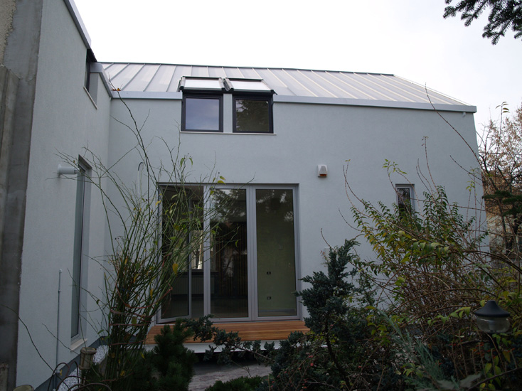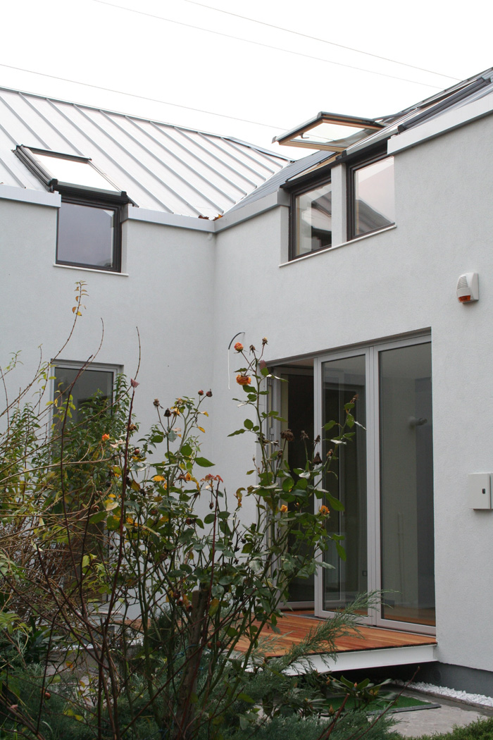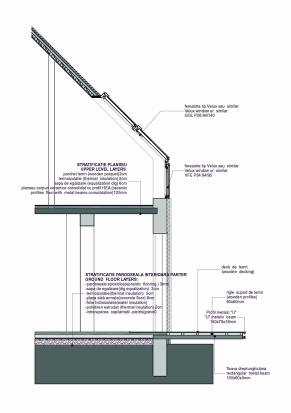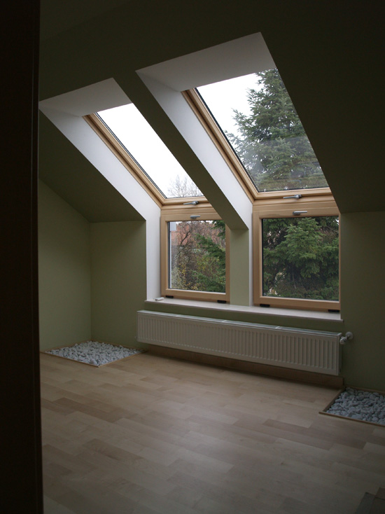 Iluminarea spatiilor de la mansarda s-a realizat prin intermediul geamurilor de acoperis atat la strada cat si spre curte. Deoarece spatiile dinspre curte beneficiaza de o priveliste deosebita si de intimitatea spatiului privat am optat pentru geamurile de mansarda cu iluminare in plan vertical cat si in plan orizontal.
