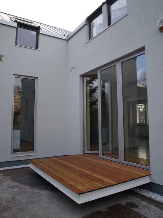 Intrarea in casa se realizeaza la nivelul unei terase suspendate cu 35 de cm fata de cota curtii, terasa ce patrunde si-n spatiul interior. Intrarea este tratata ca o terasa atat la nivelul platformei orizontale cat si prin intermediul vitrinei ce se deschide complet aducand astfel spatiul gradinii cat mai aproape de spatiul interior al casei. Intrarea-terasa relationeaza direct cu locul de luat masa, situat intre living si bucatarie.