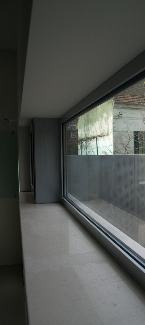 Scara spre mansarda se ia din zona „intrarii-terasa”- ca material s-a optat pentru tabla vopsita in alb- si te duce intr-un hol cu vedere spre curtea „strajuita” de vegetatie. Spatiul acesta s-a dorit unul de citit, de baut cafeaua, de lenevit. Cele doua ferestre permit o relatie vizuala interior-exterior si sunt incadrate stanga- dreapta de „oglinzi” de piatra alba rotunda unde se va amplasa vegetatie de interior pentru a accentua si mai mult aceasta relatie.