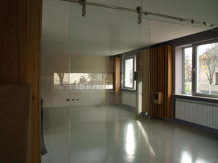 Bucataria este despartita de locul de luat masa si living printr-un perete de sticla, pentru a izola spatiul in caz de nevoie, dar in acelasi timp pastreaza o continuitate vizuala a celor trei functiuni majore ce se succed de la parter.
