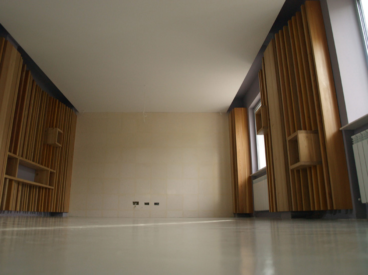 Cele trei spatii sunt tratate ca un spatiu unitar prin modul de abordare cat si prin alegerea finisajelor, atat la nivelul planului orizontal- pardoseala epoxidica, tavan fals continuu de culoare alba, cat si la nivelul planului vertical prin realizarea unor lamele de lemn continuue pe peretii longitudinali. Terminatiile spatiului unitar– peretii transversali sunt tratati in nuante de alburi diferite din cauza materialelor folosite: pal alb lucios in zona bucatariei- mobilierul, iar in zona livingului piatra alba calcaroasa.