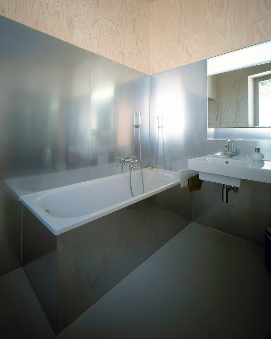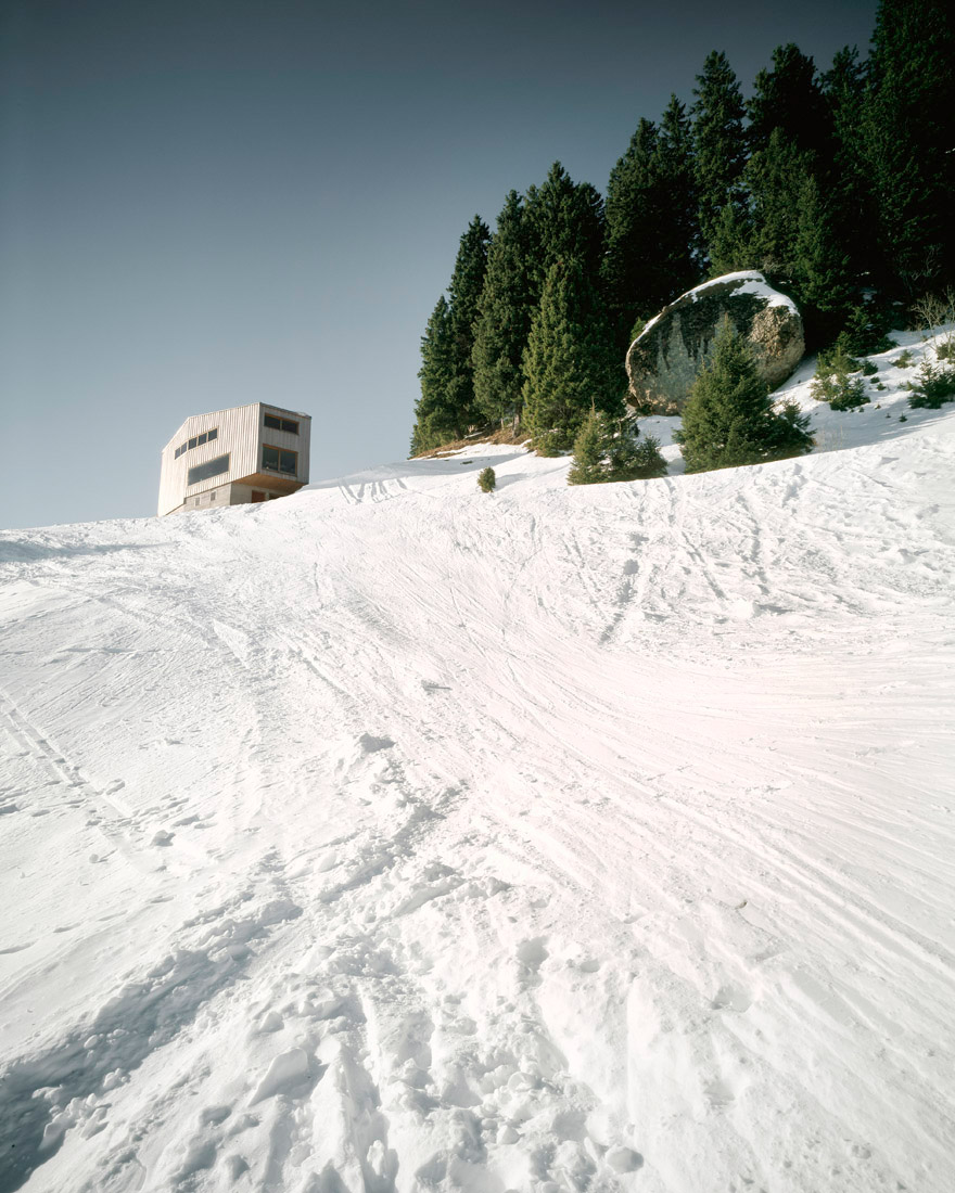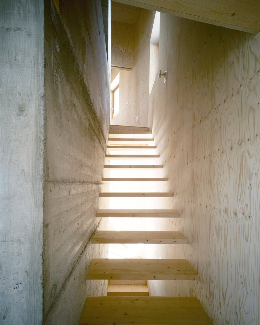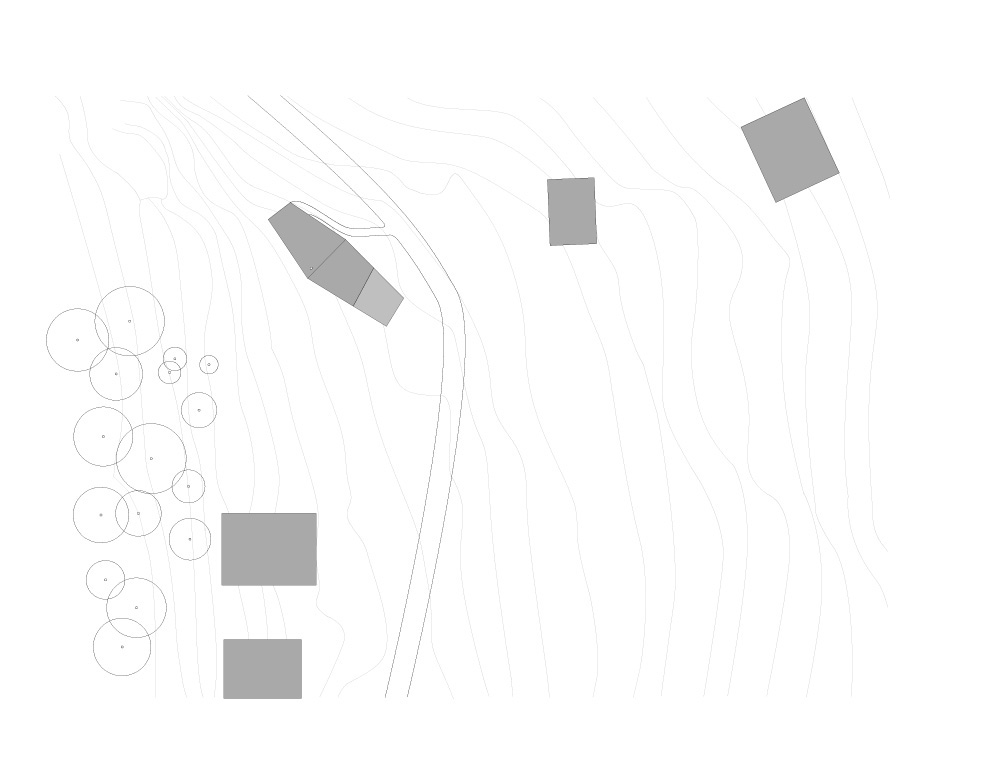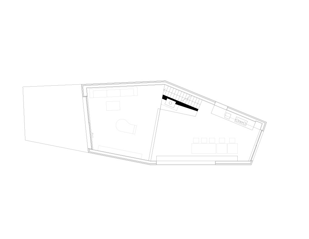 Cladirea a fost pozitionata la marginea proprietatii,astfel incat distanta pana la casele vecine este cat se poate de mare, lasand si posibilitatea de a consstrui pe teren inca o cladire. Peste pivnita din beton ancorata bine in terenul in panta,se ridica un volum din lemn asemenea unei nave.