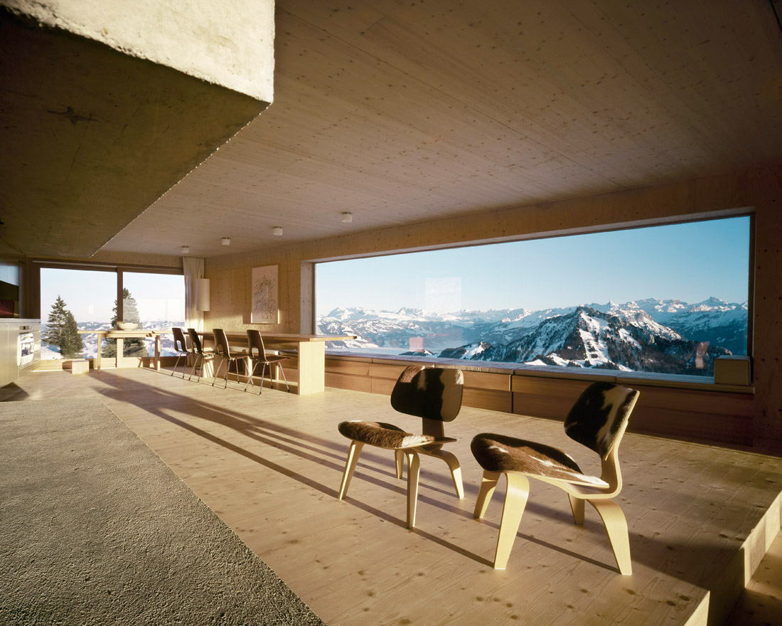 La parter se afla un living mare ce se intinde pe 2 nivele avand diferite inaltimi deschis spre o terasa exterioara,zona semienului,bucataria si o zona pentru servit masa de unde se poate observa, printr-o deschidere lunga de 5 m, peisajul magnific spre muntii din zona.