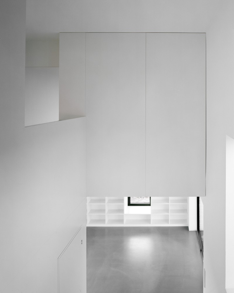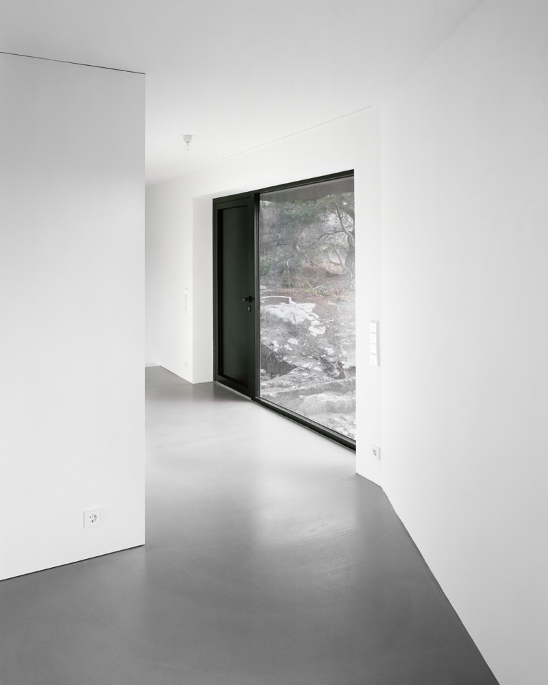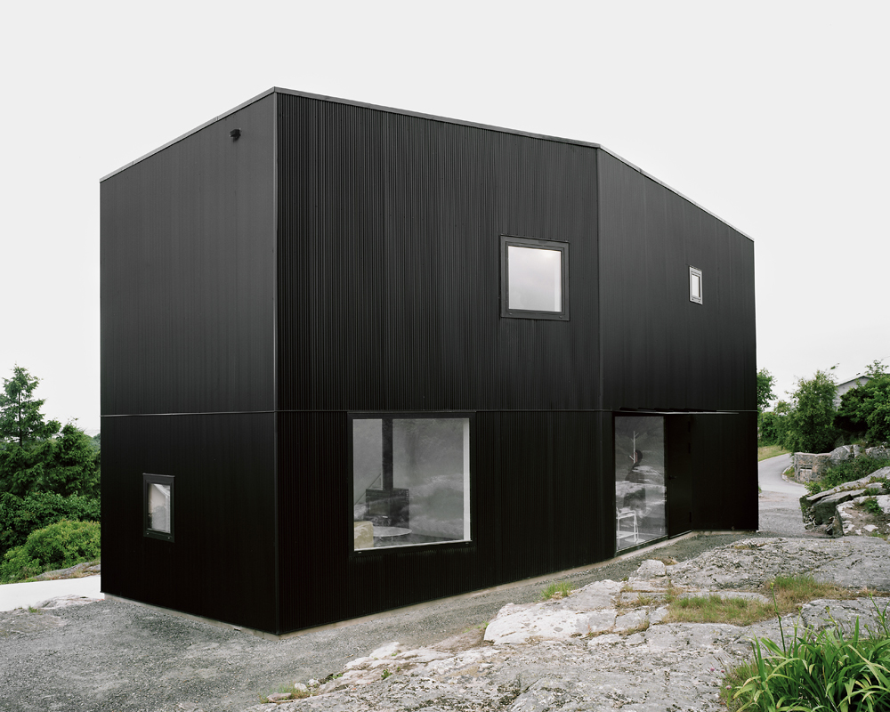 De la distanta,cladirea are tendinta sa fie abstracta,ca un simbol al unei case,dar apropiindute de ea devine mai mult fizica si prezenta si iti dai seama ca este ceva asemanator unei case,fiind un volum simplu NEGRU la exterior cu goluri mari ce dau spre un interior ALB.