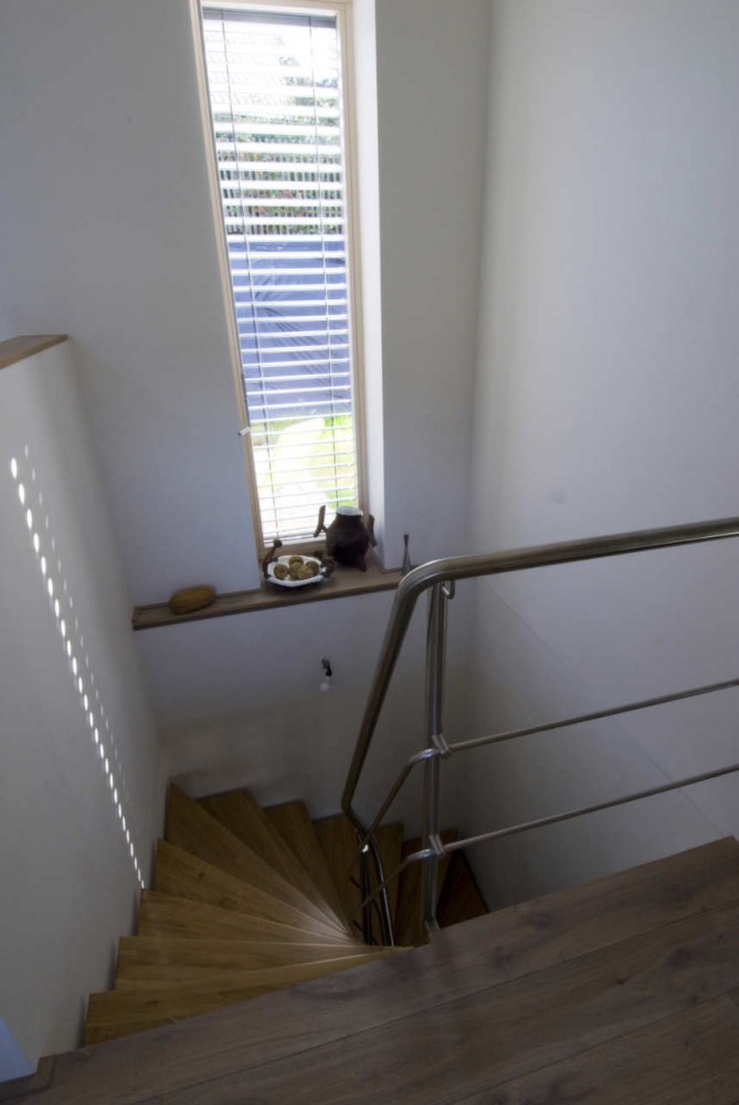 Doua dormitoare, instalaţii sanitare, o camera tehnica si un spatiu de depozitare sunt situate la etajul de jos.Cea mai mare parte din suprafata etajului superior o ocupa camera de zi ce intra in legatura cu bucataria.