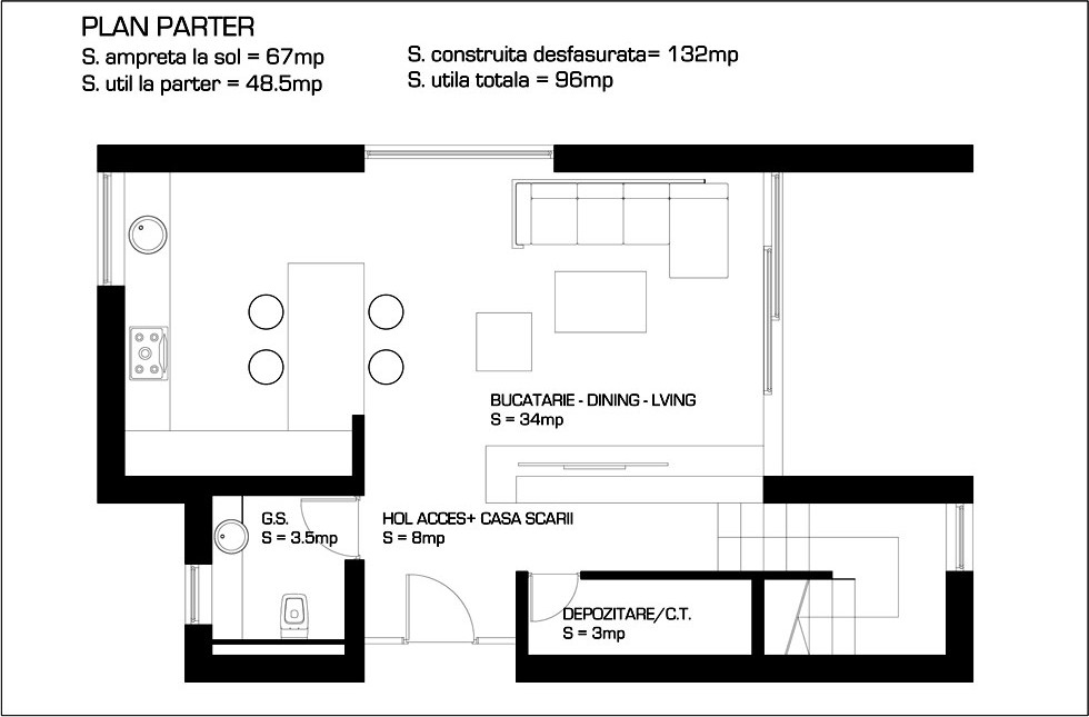 Casa are regim de inaltime P+1, suprafata construita la sol fiind de 68 mp, iar suprafata totala desfasurata de 132 mp, rezultant o locuinta mica, care in ciuda suprafetelor totale construite reduse ofera un spatiu interior deschis, generos pentru zona de zi.