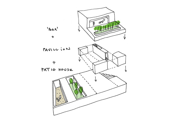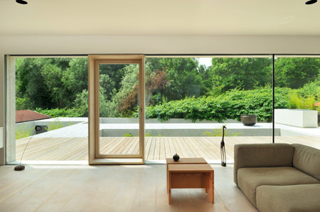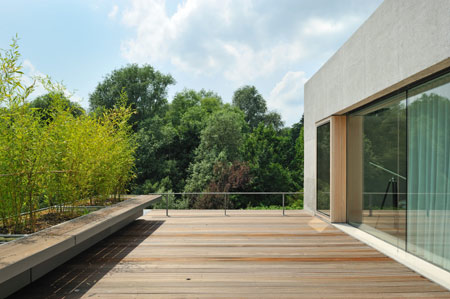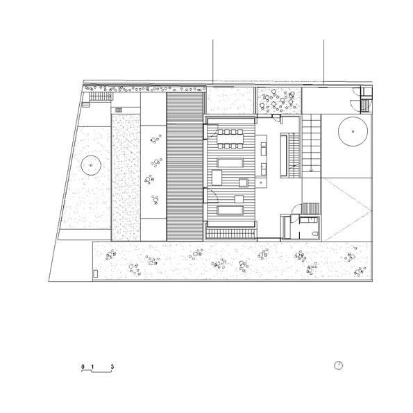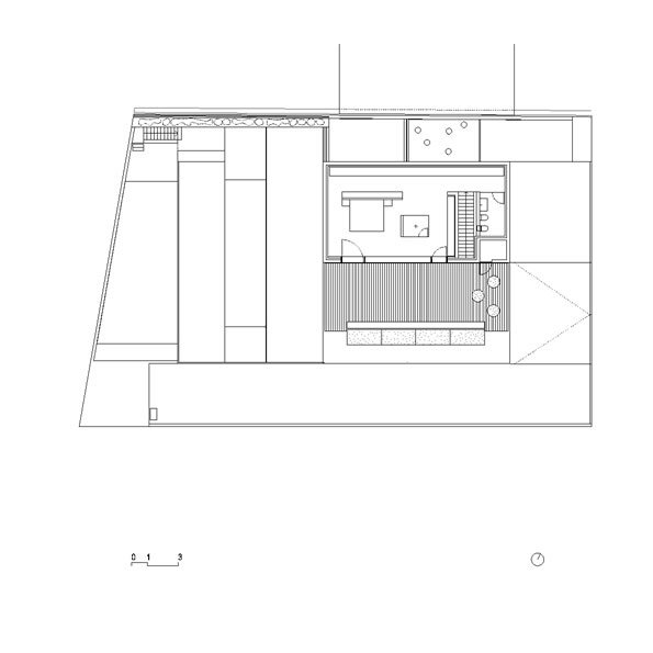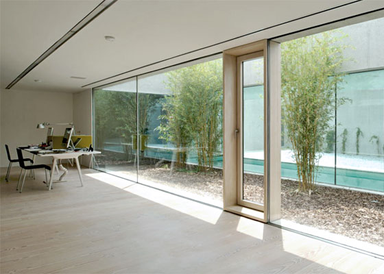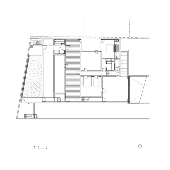 Spatiul de sport subteran care conţine un spatiu de lucru, sala de fitness, sauna, piscina, sala de muzică şi trei atriuri, formează o bază solida a casei ce acoperă aproape întreaga parcelă. Acesta este punctata prin atriumuri stabilind o relaţie continuă între interior şi spaţiile exterioare. Camerele şi piscina sunt incadrate de pereti de sticla care permit luminii naturale sa intre în spaţiu.