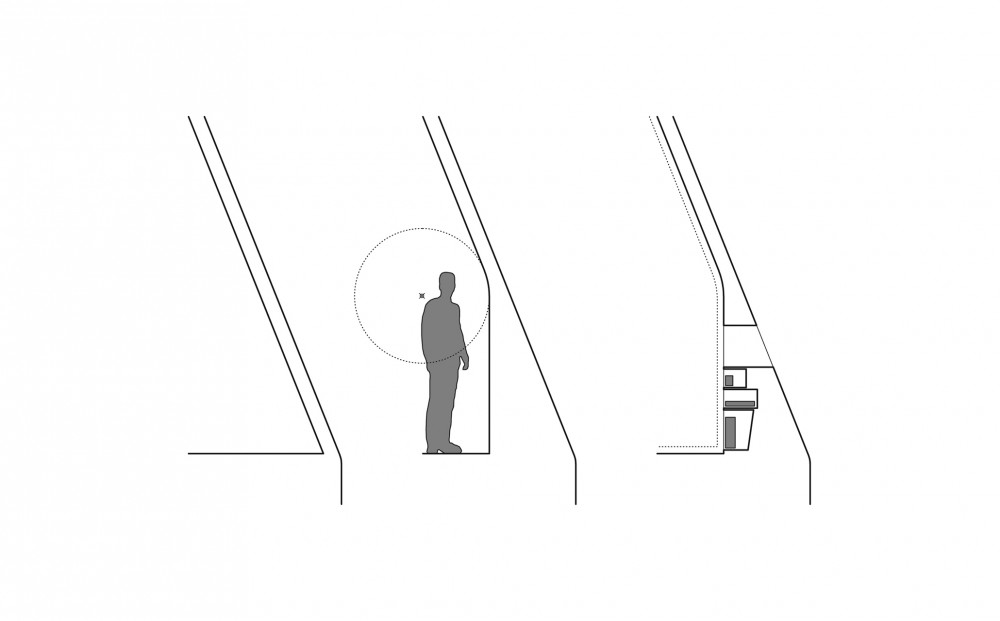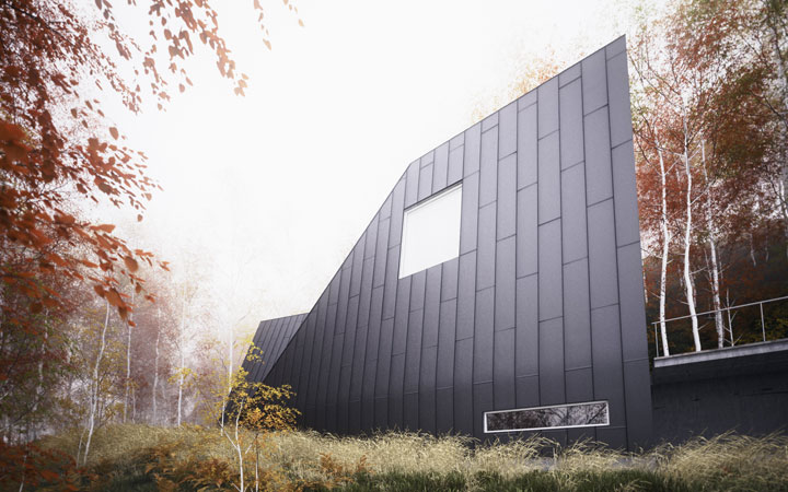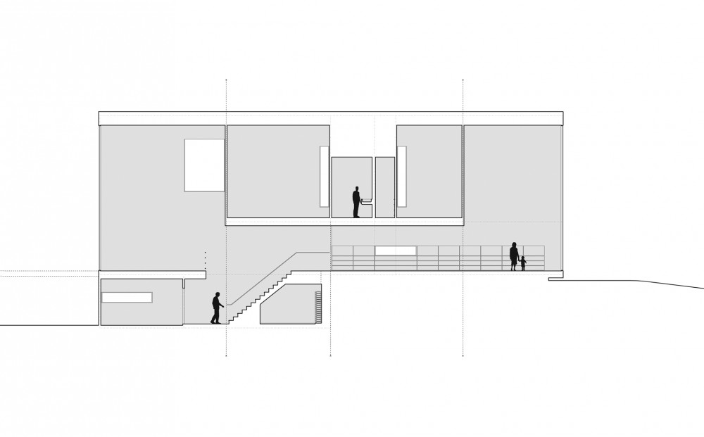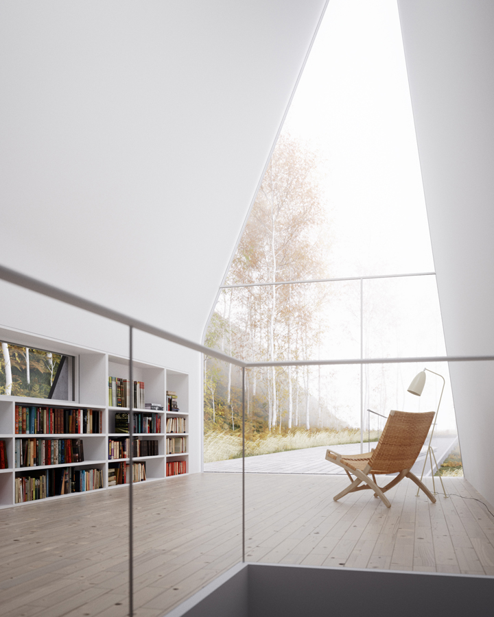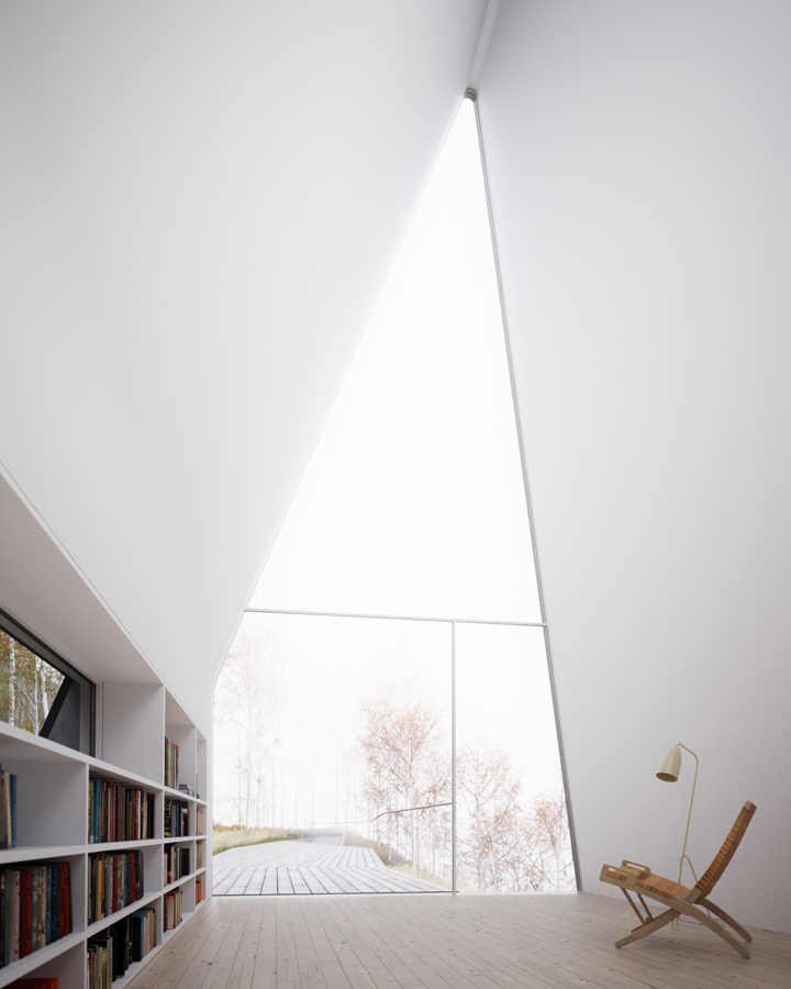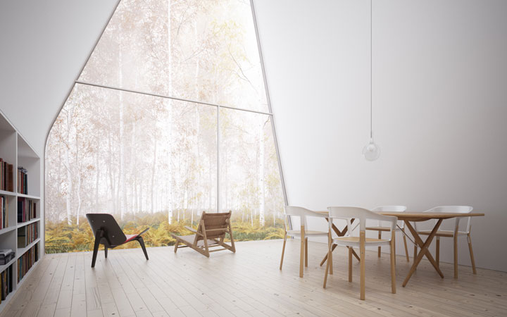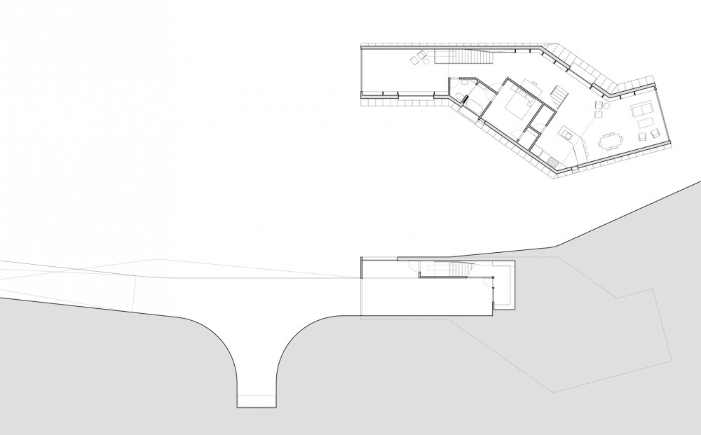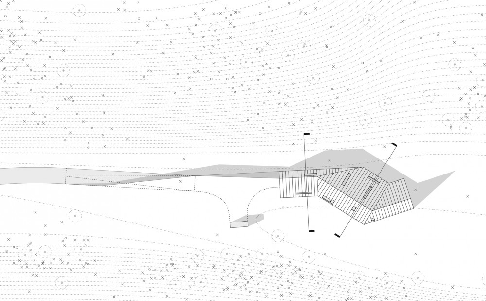 Desi este construita in mijlocul unui cadru natural superb, casa nu este deloc deschisa spre privelistile inconjuratoare. Singura zona accesibila ramane fatada principala de sticla cu cadrul de forma literei “A” a volumului initial, acoperisul cochilie reusind sa blocheze accesul vizual si fizic in restul casei.