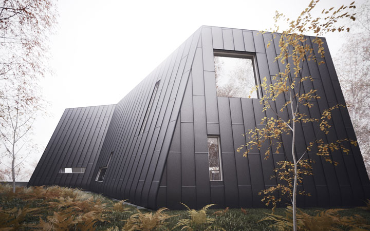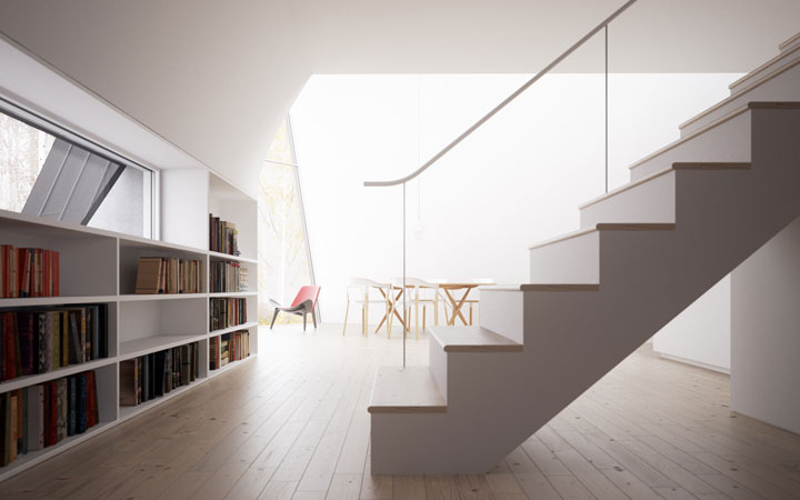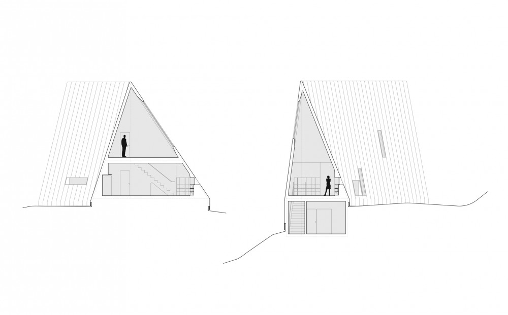 Arhitectul a legat trei volume prin extruderi orizontale pornind de la un volum in forma de “A”, fapt care a dat si o alta denumire casei, casa “A”.