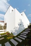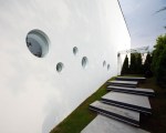 Colțurile opuse ale volumului sunt generos decupate rezultând astfel console ample și terase cu mari suprafețe vitrate pentru toate încăperile importante. Rigurozitatea decupajelor drepte este conjugată cu ludicul golurilor circulare ce le însoțesc de-a lungul fațadei spre accesul principal. Accesul este clar marcat în plinul fațadei de copertina dreaptă din sticlă transparentă și de parcursul ascendent pe planul înclinat înierbat care începe de la poartă.