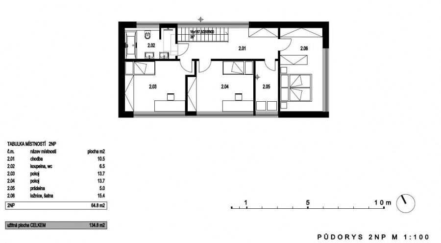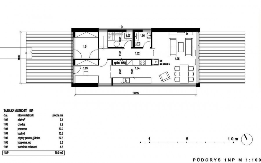 Cladirea propusa este parter + etaj , cu un acoperis in 2 ape, inclinatie de 25 ° ,amplasat pe directia longitudinala. Forma lunguiata a cladiri este accentuata de 2 terase una pe directia vest ,cealalta pe est. La parter avem camera de zi, bucataria cu loc de luat masa, un birou,spatiu tehnic si un grup sanitar. Al doilea etaj este format din 3 dormitoare, spalatorie si o baie comuna.