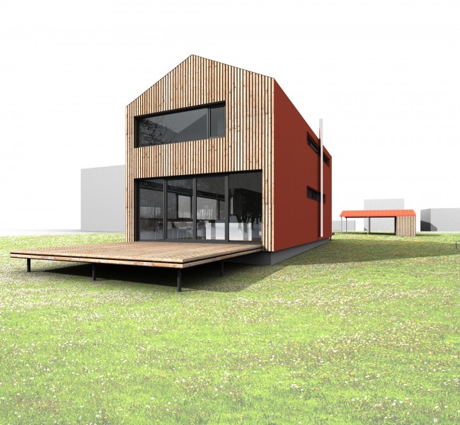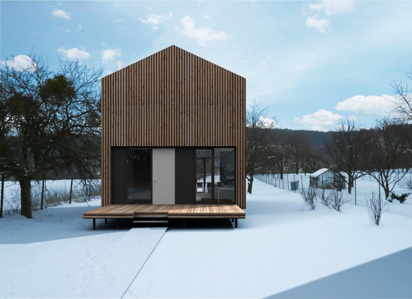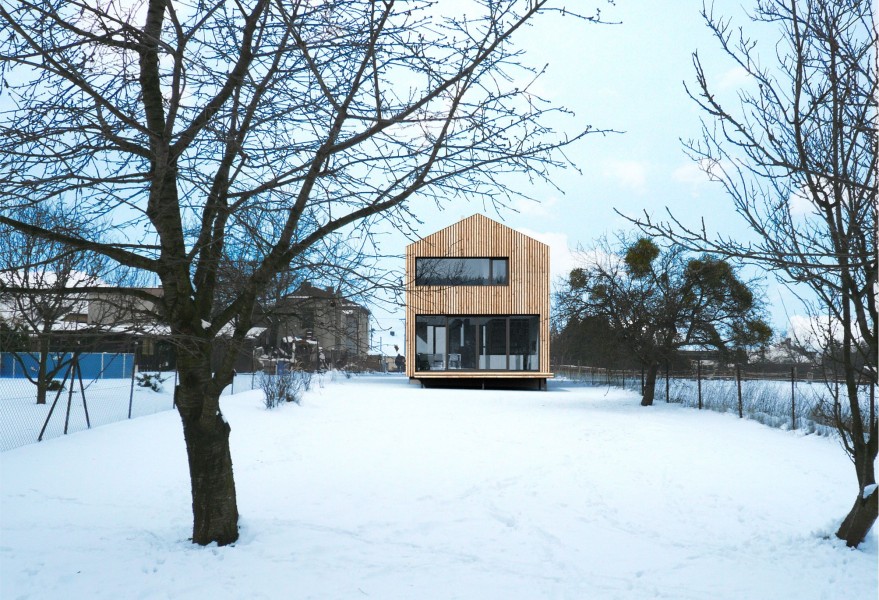 La exterior cele doua fatade fronton sunt tratete simplu cu placaj vertical din lemn si zone vitrate mari. Fatadele de pe nord si sud devin o coaja, care impreuna cu acoperisul imbraca casa.