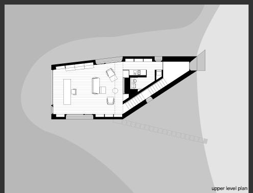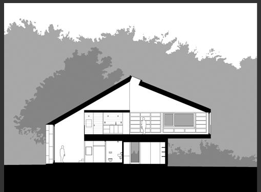 Usa transparenta cu o rama simpla din lemn se deschide spre planul casei in forma de palnie. Intrarea, ce simbolizeaza defapt un acces in peisajul impadurit, inalta pe doua nivele, conduce spre bucataria si baia din imediata sa apropiere, si spre spatiile relaxare si de lucru de la etaj. Fatadele orientate spre nord si spre sud, sunt orientate sub un unghi ce asigura accesul in abundenta a luminii naturale, prin suprafetele mari ale ferestrelor.