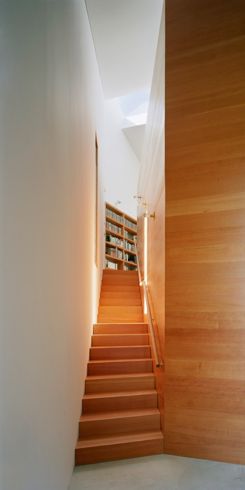Interioarele sunt definite de esenta lemnului folosit, de carti si de lumina naturala. Scara interioara te conduce in spatiul de lucru de la etaj, ce vegheaza asupra peisajelor padurii. Acest corp iesit in consola creaza o terasa acoperita la nivelul pamantului, un spatiu perfect pentru lecturarea unei carti.