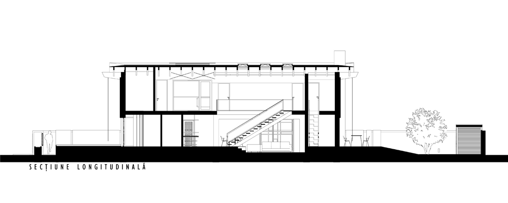 Proiectul conformeaza spatial doua probleme „fizice”, limita din dreapta parcelei spre care imobilul s-a „incapatanat” sa nu se exprime prin calcan si in acelasi timp cornisa sa devina reprezentativa pentru concept – fly house, ca expresie a unui alt mod de abordare.