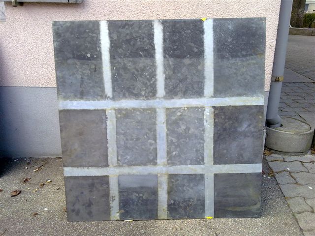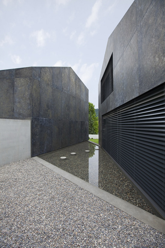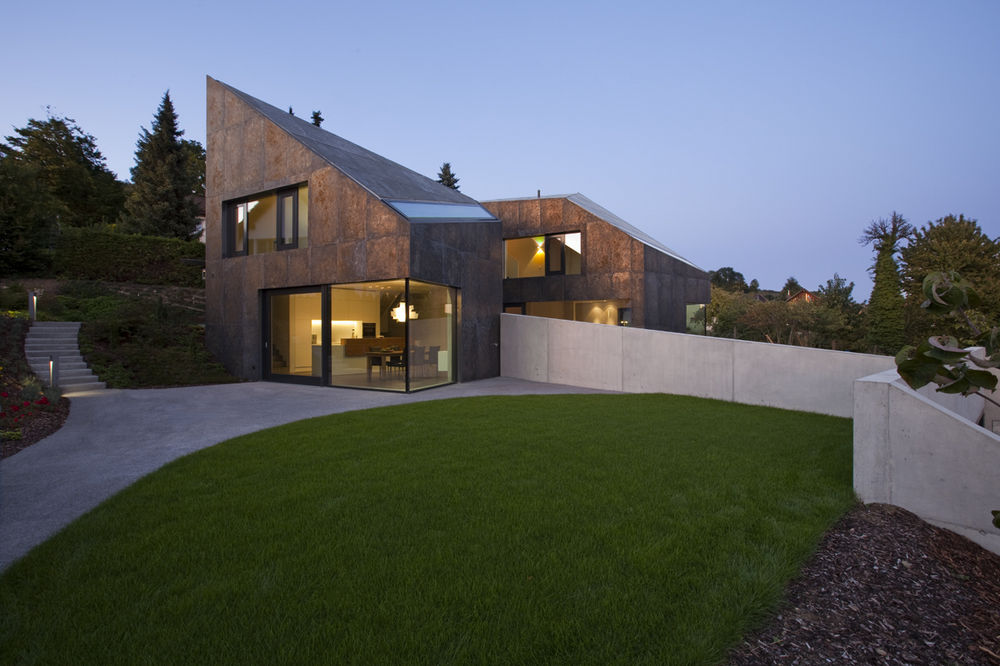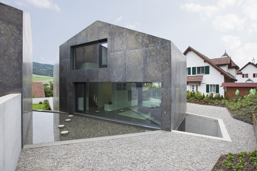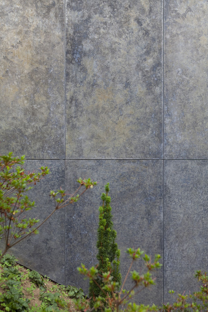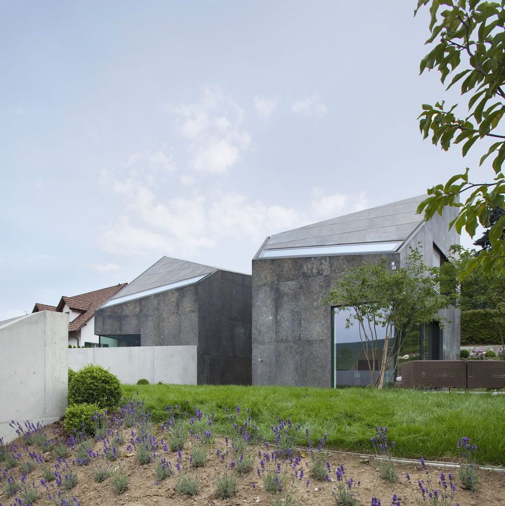 La prima vedere, casa pare a fi placata cu beton aparent finisat, sau chiar marmura, dar nu este asa. Fatadele sunt placate cu otel zincat, material folosit si la acoperisul casei. Pentru aceste forme s-a dorit un material extraordinar cu un efect salbatic si schimbator in functie de lumina zilei. Dupa mai multe incercari pe panouri de scara 1:1 , s-a hotarat ca acest material este perfect pentru imaginea casei.