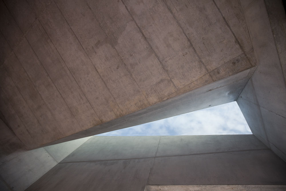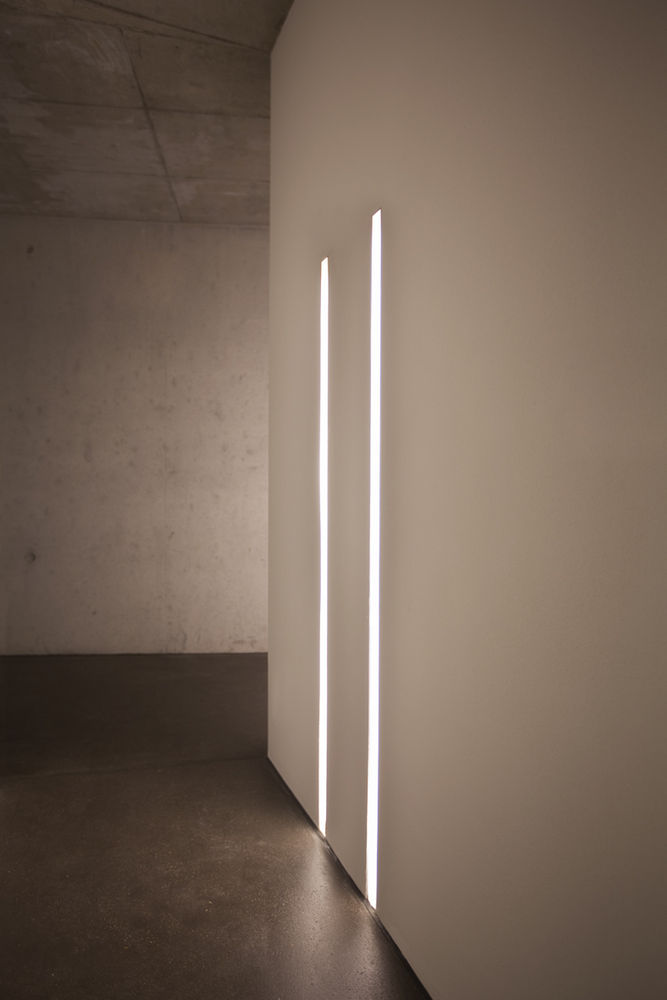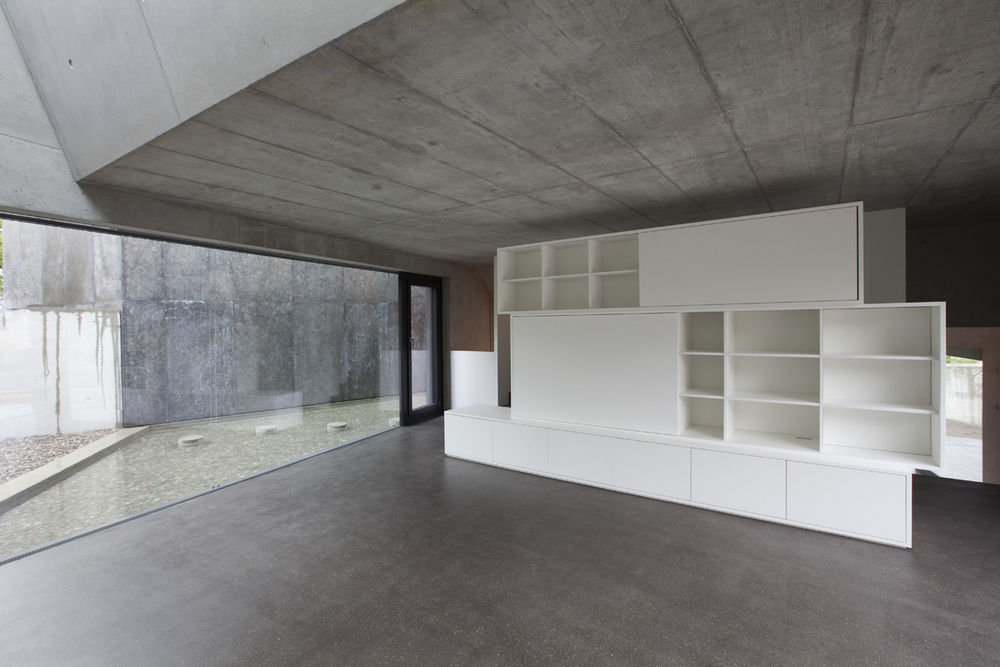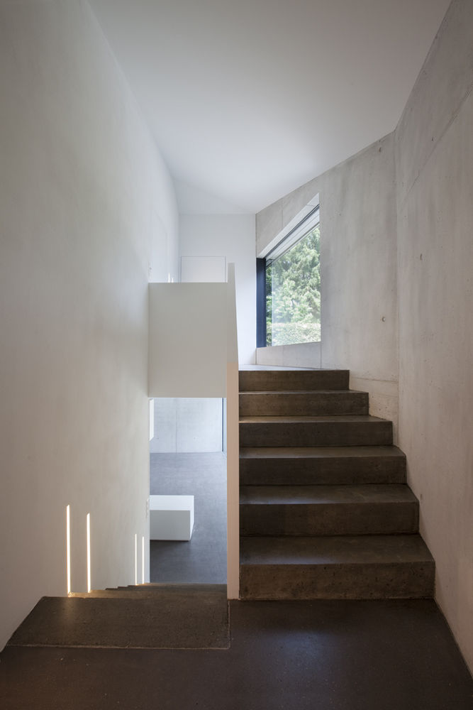 In timp ce peretii interiori sunt fin tencuiti, peretii exteriori din beton placati cu otel zincat, podeaua neagra lustruita si ferestrele cu deschideri mari dau o imagine rece si tehnica. Noroc cu lucarnele ce permit luminii naturale sa transforme atmosfera rece intr-una plina de viata si forta.
