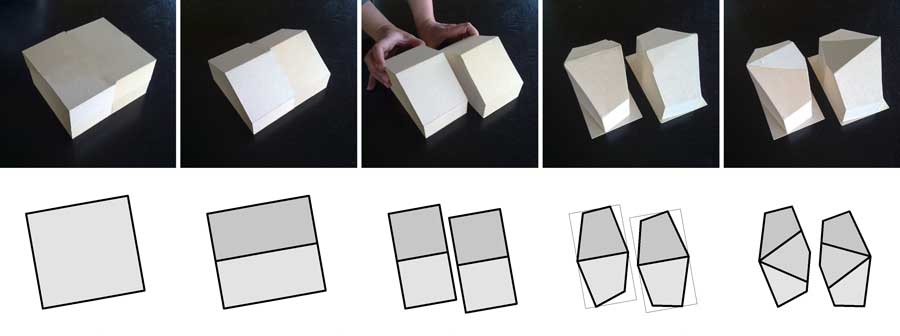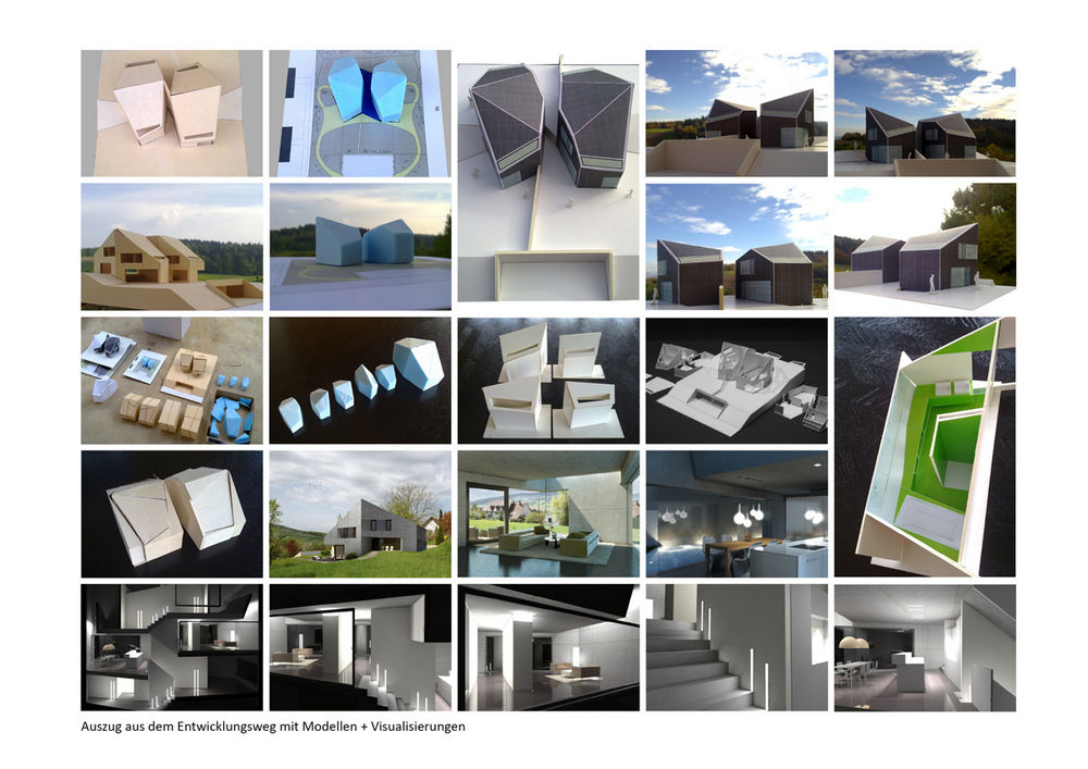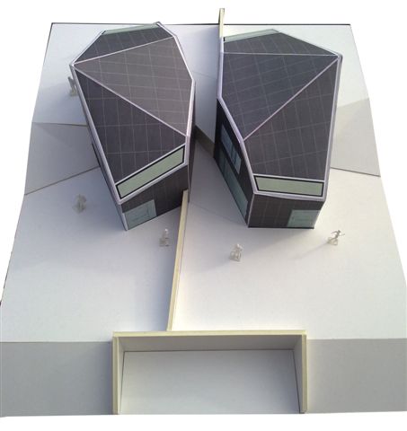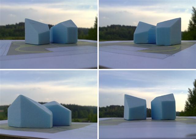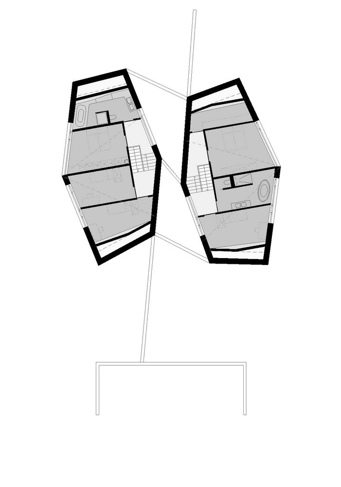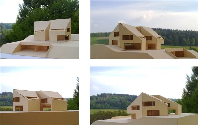 In ciuda dimensiunilor mici ale parcelelor de teren, in loc de o casa tip duplex s-au realizat 2 case foarte apropiate intr-un decor rural, dar despartite de o pelicula de apa, fiind total diferite de casele din jur atat ca volumetrie cat si definitie spatiala. Ideea de baza a casei a fost divizarea si dorinta de a crea ceva special, adoptandu-se o volumetrie tip sculptura.