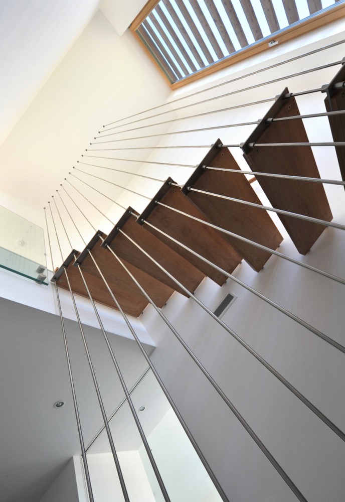 Parterul cuprinde pe langa un carport si o depozitare, zona de zi a casei ce e formata din hol de acces, baie ,birou, bucatarie si un living generos.Acesta din urma se deschide spre exterior cu ajutorul unei terase. La etaj se afla dormitorul matrimonial cu baie proprie si doua camere pentru copii cu baie comuna. Scopul principal al casei a fost reducerea la minimum a coridoarelor, circulatiilor adica a spatiilor folosite mai rar.Legatura intre nivele se face printr-o scara usoara, cu trepte din lemn, suspendata pe bare de otel din tavan.