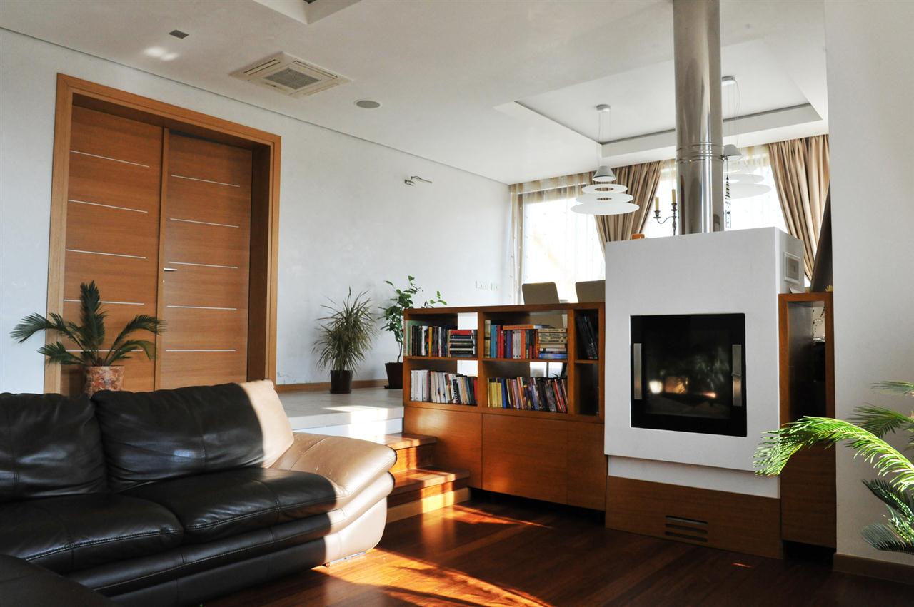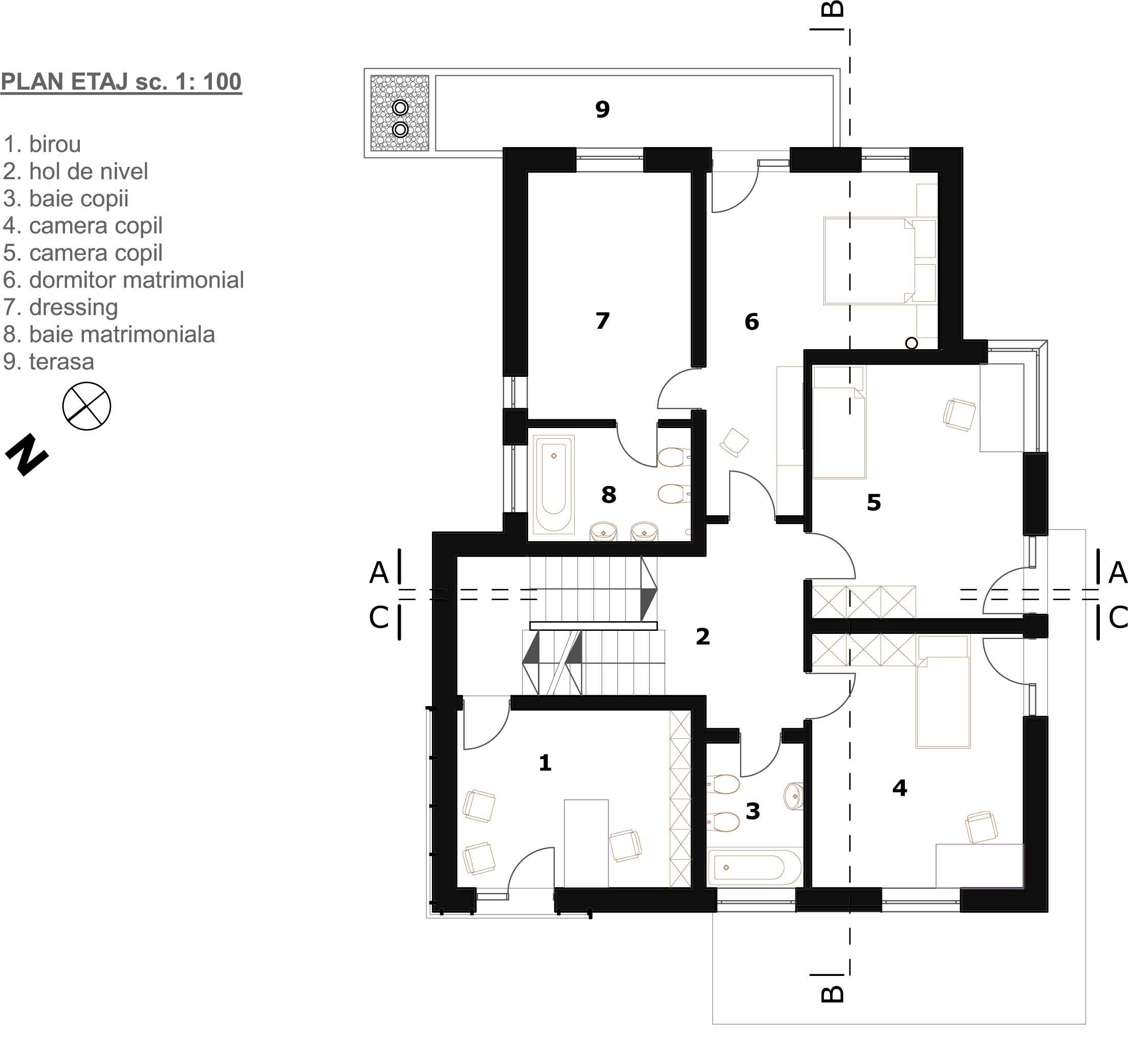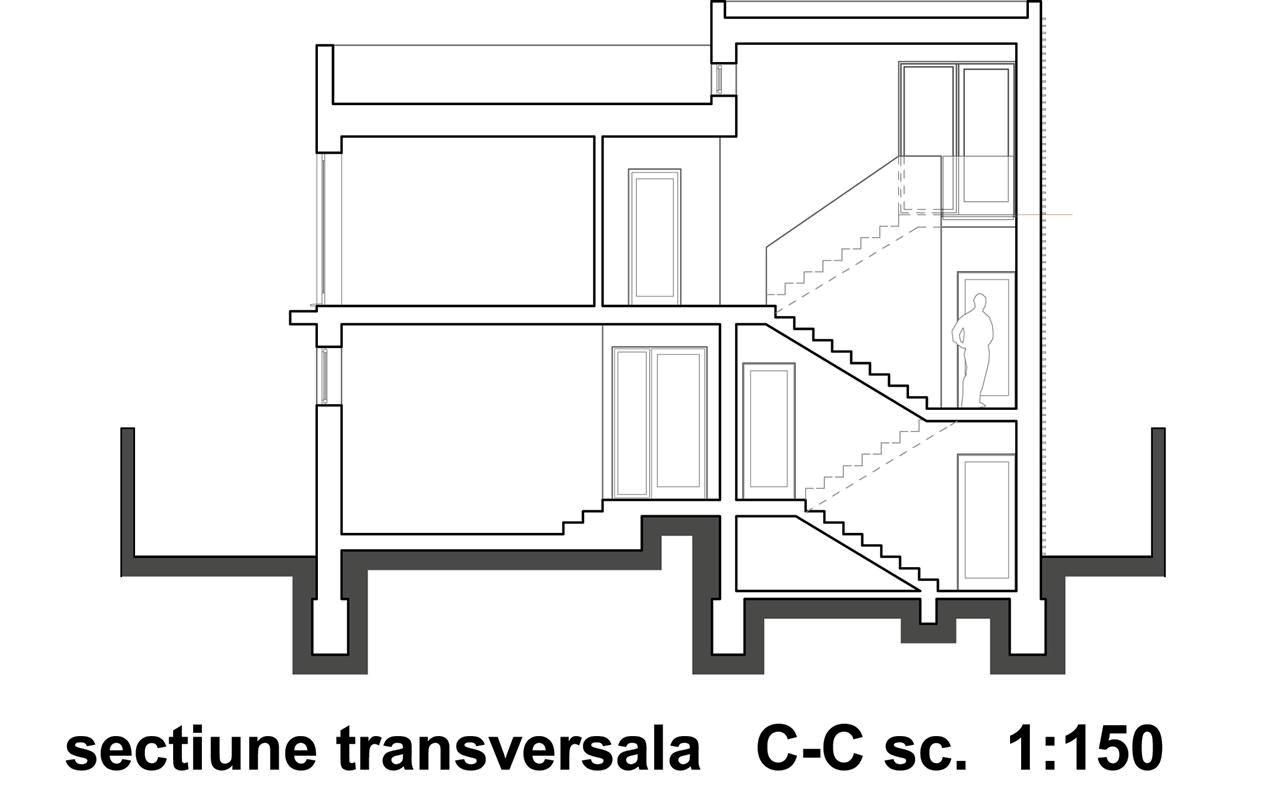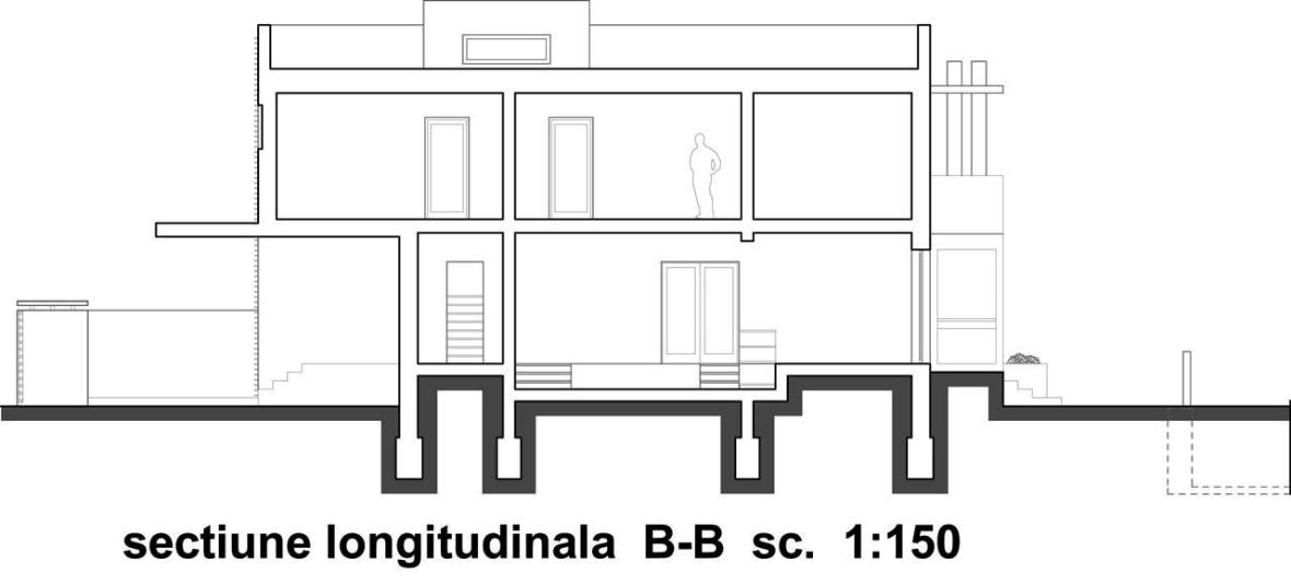 In incercarea de a reduce cat mai mult zona de circulatii spre etaj, am decalat nivelurile astfel incat am introdus la jumatate de nivel un demisol tehnic, un birou deasupra acestuia si o terasa intermediara la nivelul superior – „cuib”, in proximitatea zonei copiilor pentru a le crea o zona de joaca comuna, retrasa de restul casei.