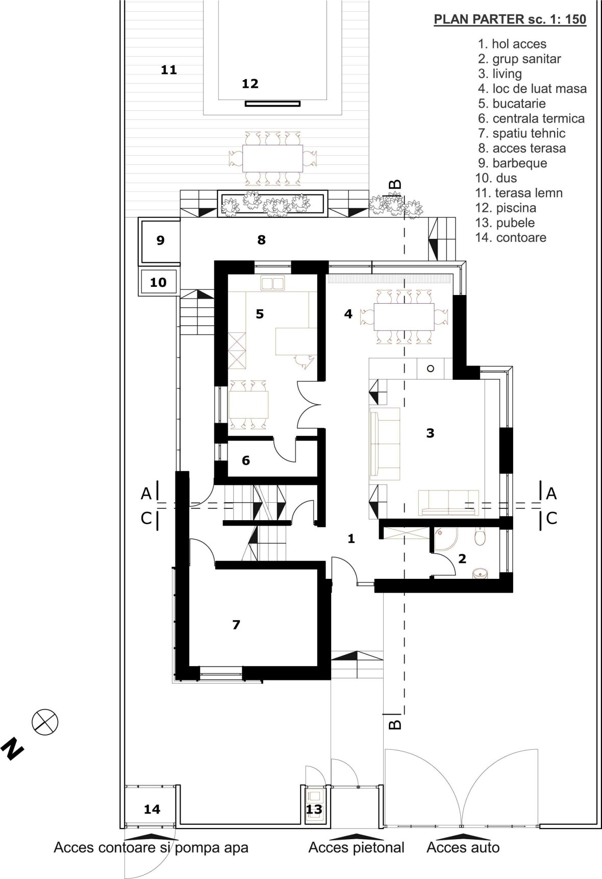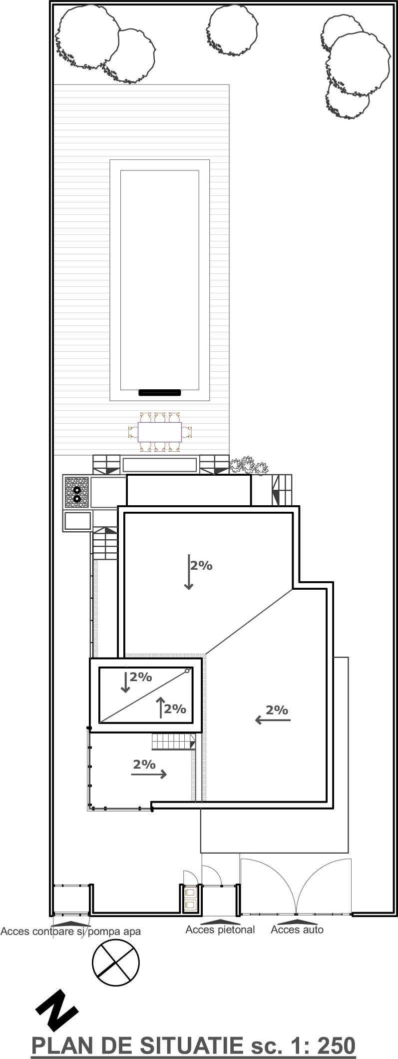 Dispunerea axei longitudinale a terenului pe directia NE-SV a generat distributia zonelor in casa. Terenul avea avantajul amplasarii curtii spre sud, prin urmare am deschis casa spre curte prin vitraje ample, spre o zona privata si am inchis-o discret spre nord, spre spatiul public – strada.