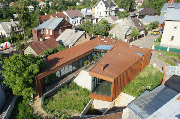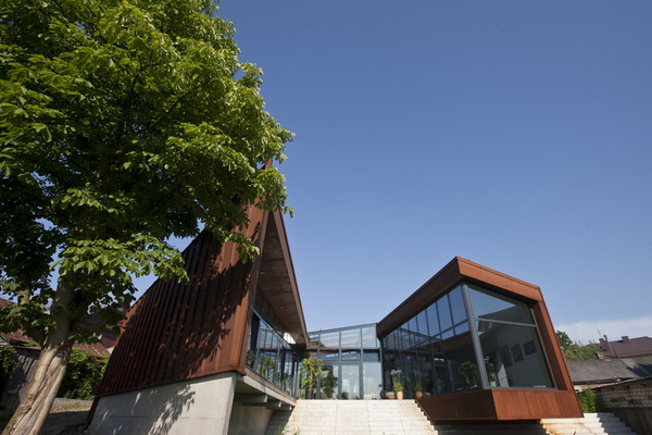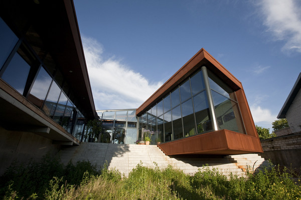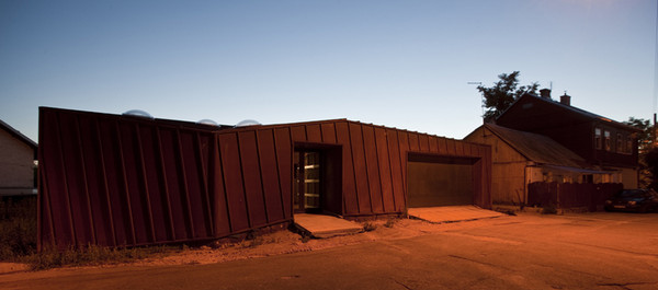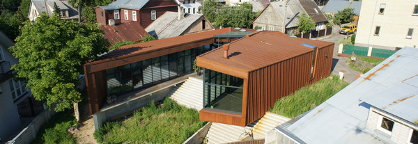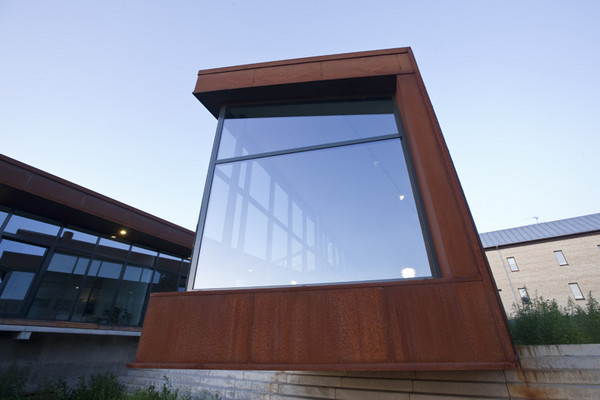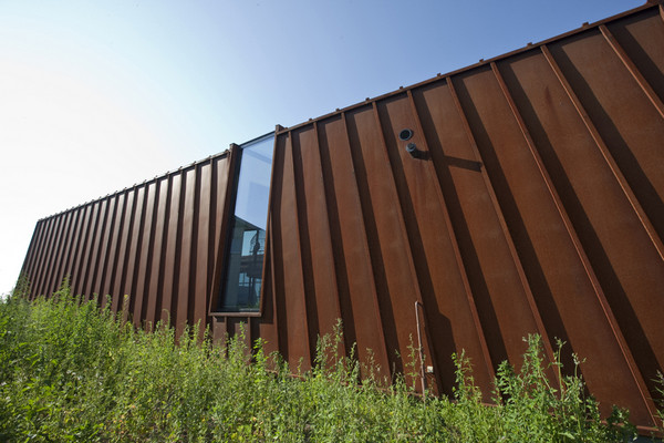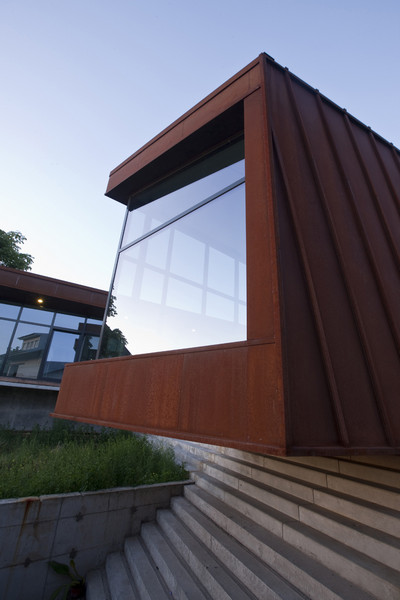 Fatadele casei sunt realizate din Cor-Ten® (un material cu oxidare controlata, care ofera un dublu avantaj: rezolva problema longevitatii constructiilor si a placarii de fatade in zonele cu umiditate ridicata si permite in acelasi timp si numeroase aplicatii cu valoare estetica deosebita. Materialul este 100% reciclabil si nu necesita vopsire.) pentru a sublinia fundalul social al cladirii.