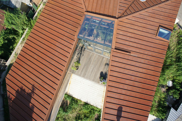 Terasa leaga cele doua laturi ale casei: din zona dormitoarelor se poate vedea in living si invers.Baia este legate de gradina interioara din centrul casei.