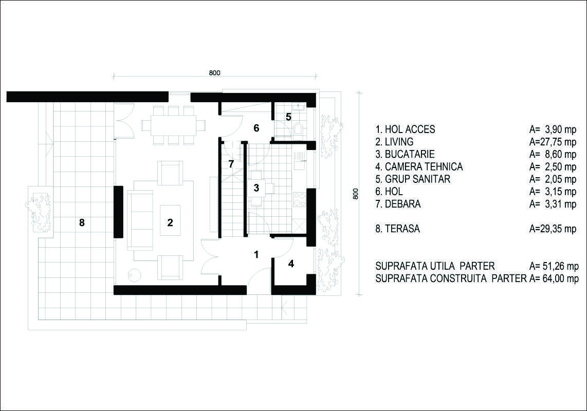Arhitectii de la Arhi DOT Design propun o constructie care se poate adapta oricarui teren, avand o amprenta la sol restransa.In parter aceasta se incadreaza in 8x8m. Desi suprafata construita este mica, prin compartimentare s-a urmarit sa se obtina suprafete utile cat mai mari pentru camerele de locuit. Compactarea instalatiilor pe o singura latura, pe trasee scurte va da casei un plus de economie.Livingul generos de 27 mp, include locul de luat masa si are deschidere catre terasa, bucataria are dublu acces, dinspe intrare si dinspre locul de luat masa.