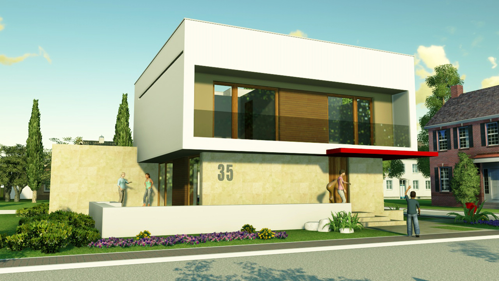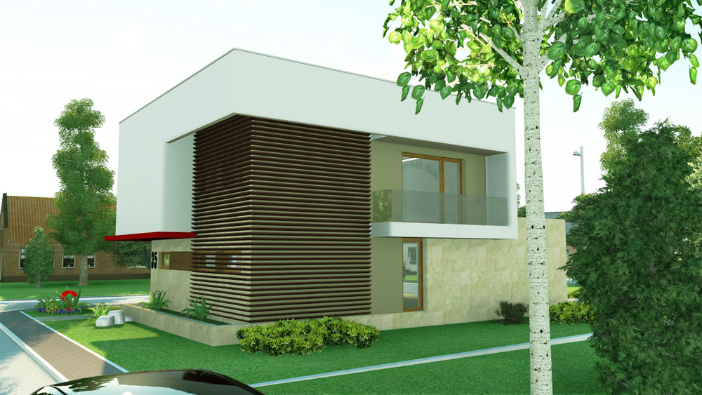 Pentru exterior s-a propus o imagine minimalista, cu o volumetrie ce aminteste de casele interbelice. Atice inalte mascheaza acoperirea in sarpanta. Tonurile calde de pamant sunt scoase in evidenta de supafetele mari albe. Zona de acces este marcata printr-o copetina.