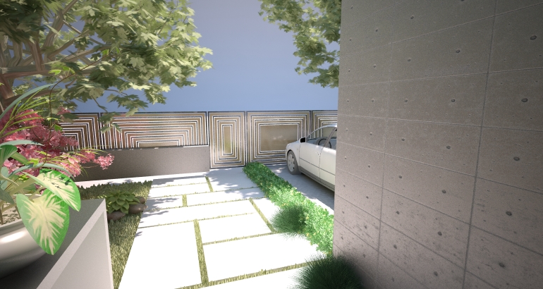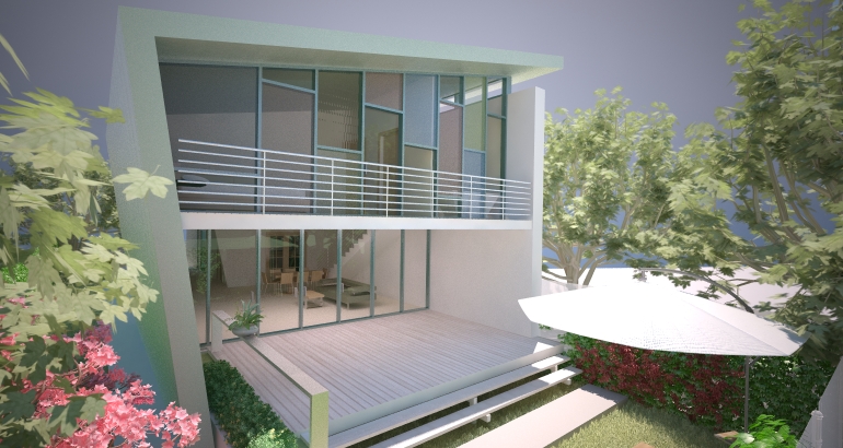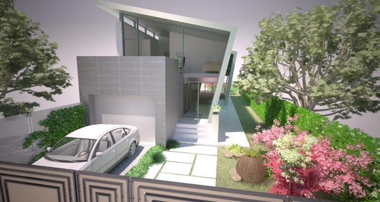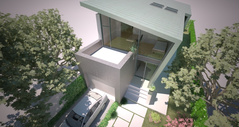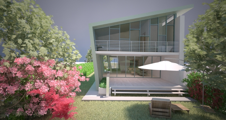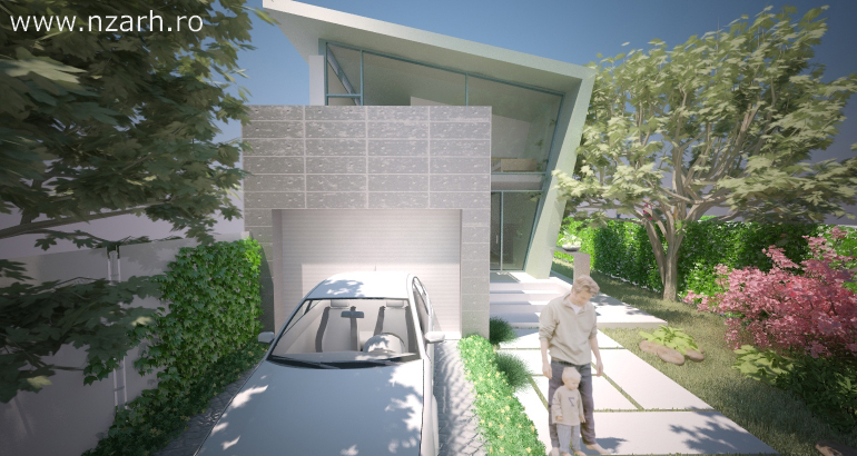 Constructia, o varianta de casa moderna cu deschideri mari si vitraje pe doua laturi ale volumului, este o solutie avantajoasa pentru terenurile inguste si lungi. Cladirea asemenea unei palnii face legatura dintre zona curtii dinspre drumul de acces si spatiul privat al curtii din spate.