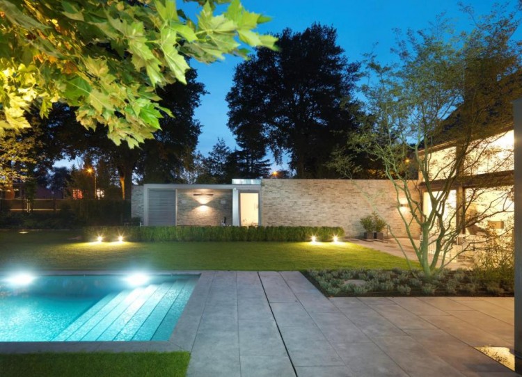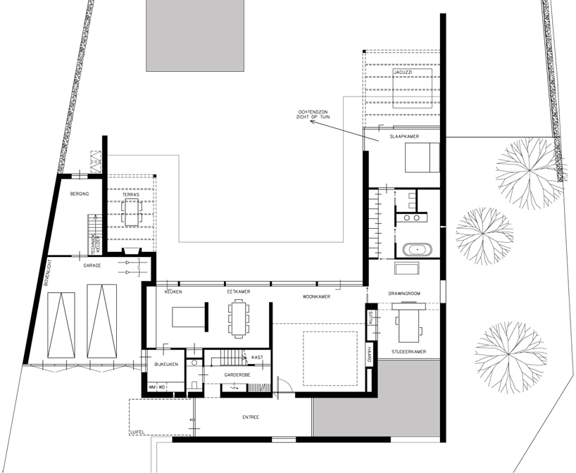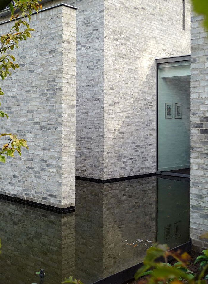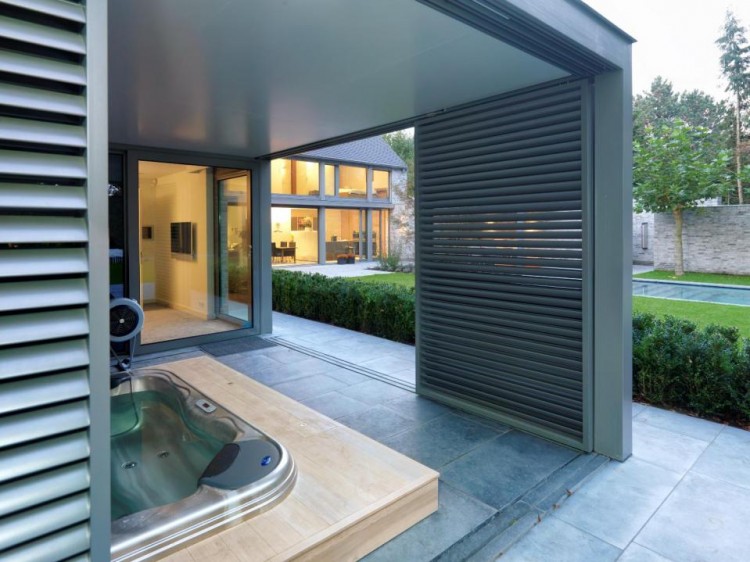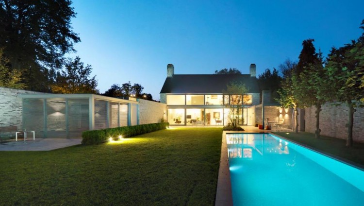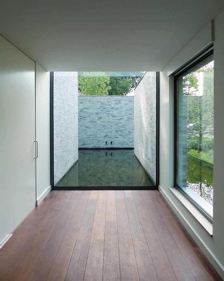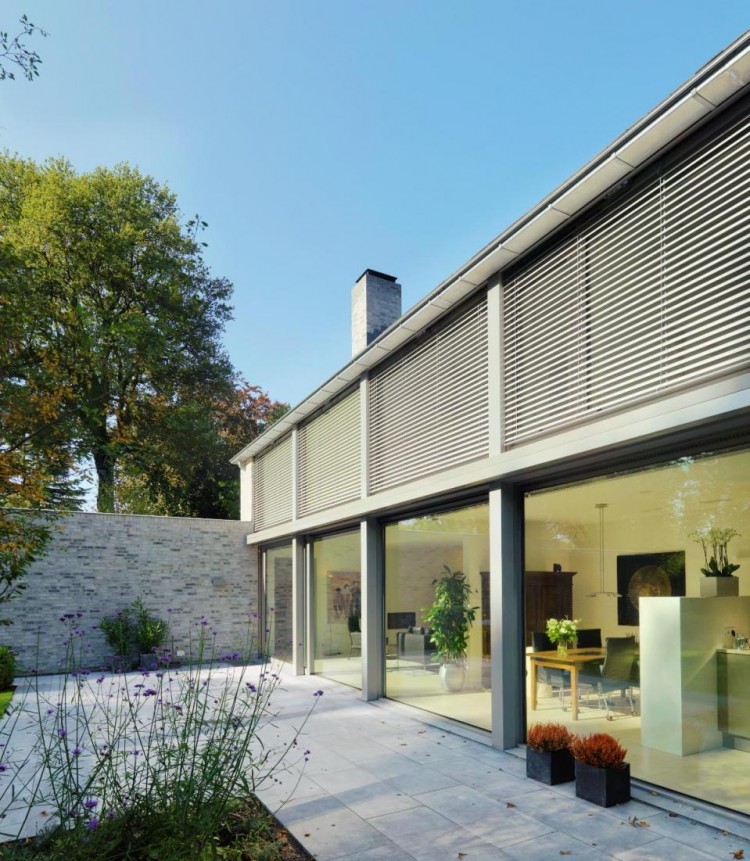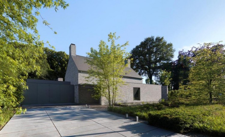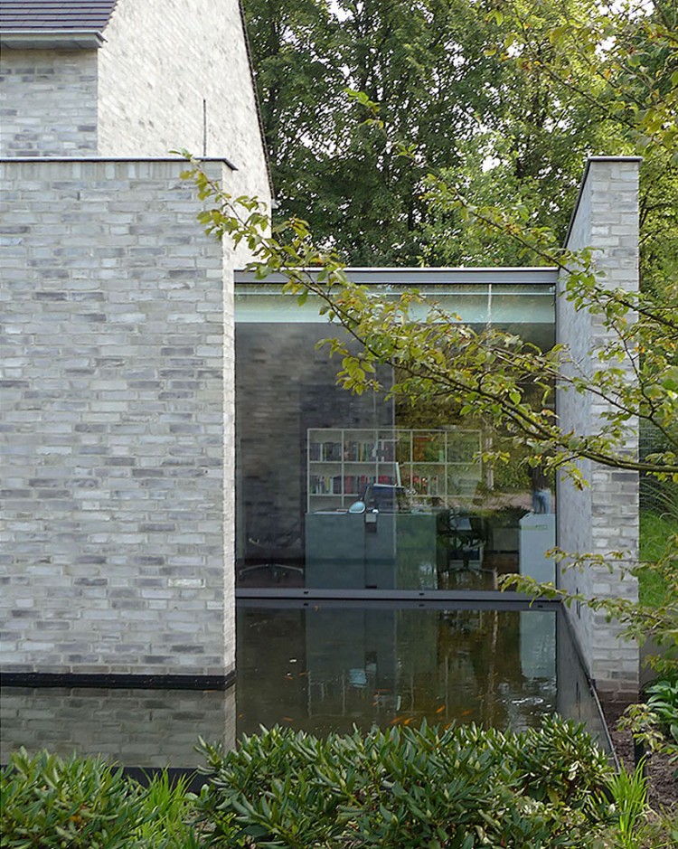 Un perete inchide perimetrul parcelei cu gradina spatioasa si asigura intimitatea locuitorilor. Fatada orientata spre gradina este complet transparenta, iar peretii de sticla se inalta de la nivelul terenului pana la jumatatea celui de-al doilea etaj. Cu ajutorul acestei zone mari vitrate spatiul exterior este adus mai aproape de interior. Nuantele de gri folosite la finisarea suprafetelor exterioare: caramida gri-deschis si tiglele acoperisului gri-inchis, sunt tipice repertoriului arhitectilor Bedaux.