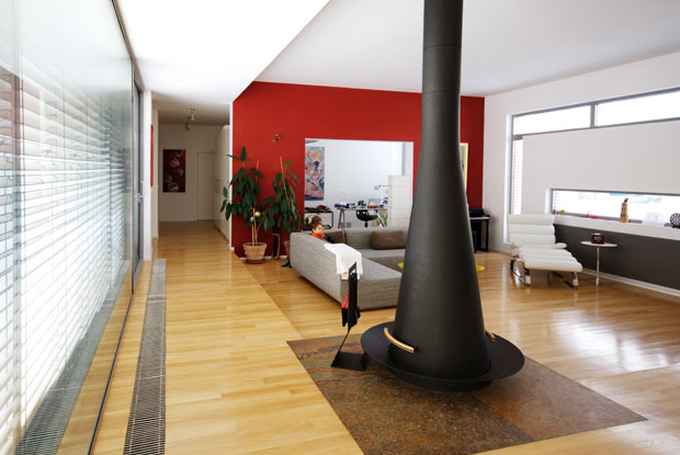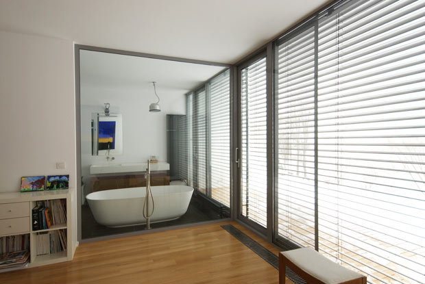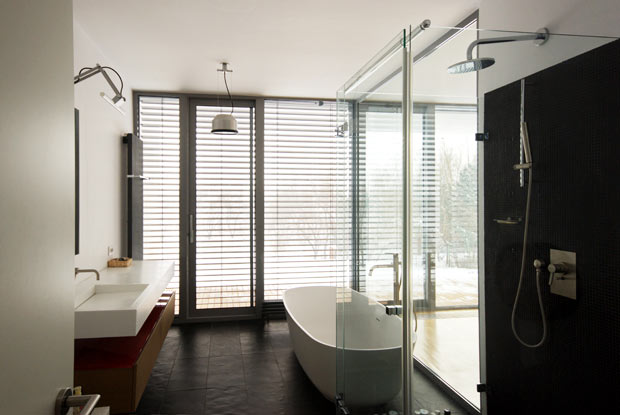 Spatiile comune: living-ul, bucataria, locul de luat masa, biroul si piscina, precum si holul de acces la dormitoare – sunt deschise si in contact vizual. Punctul comun al acestor spatii il reprezinta terasa principala in contact cu living-ul. Zona privata – dormitoarele copiilor, parintilor si cel pentru oaspeti – dispun de terase si orientari separate ce confera identitate si autonomie fiecareia dintre subzonele astfel create.