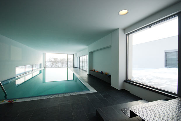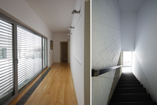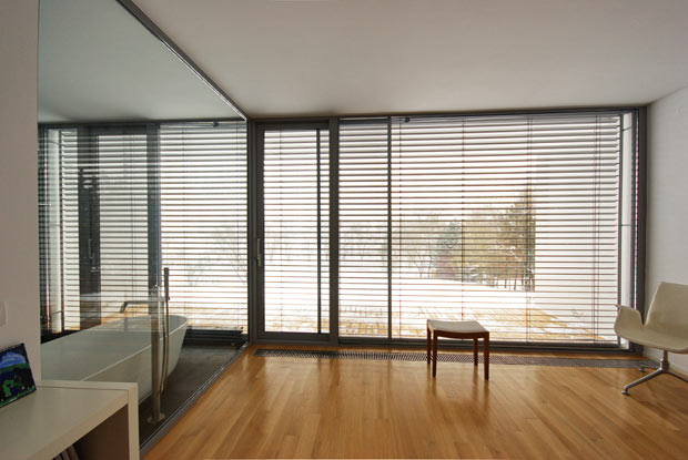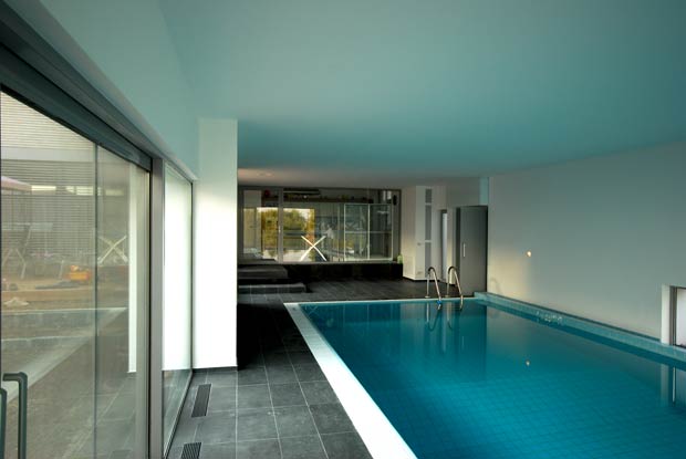 Locuinta este dezvoltata aproape integral pe parter si este alcatuita din trei corpuri vizual distincte dar continue spatial, doua dispuse longitudinal pe directia terenului (unul dedicat dormitoarelor, biroului si camerei de oaspeti, iar cel de-al doilea acomodand spatiile de acces, si piscina interioara) si unul transversal (ce adaposteste living-ul si bucataria).