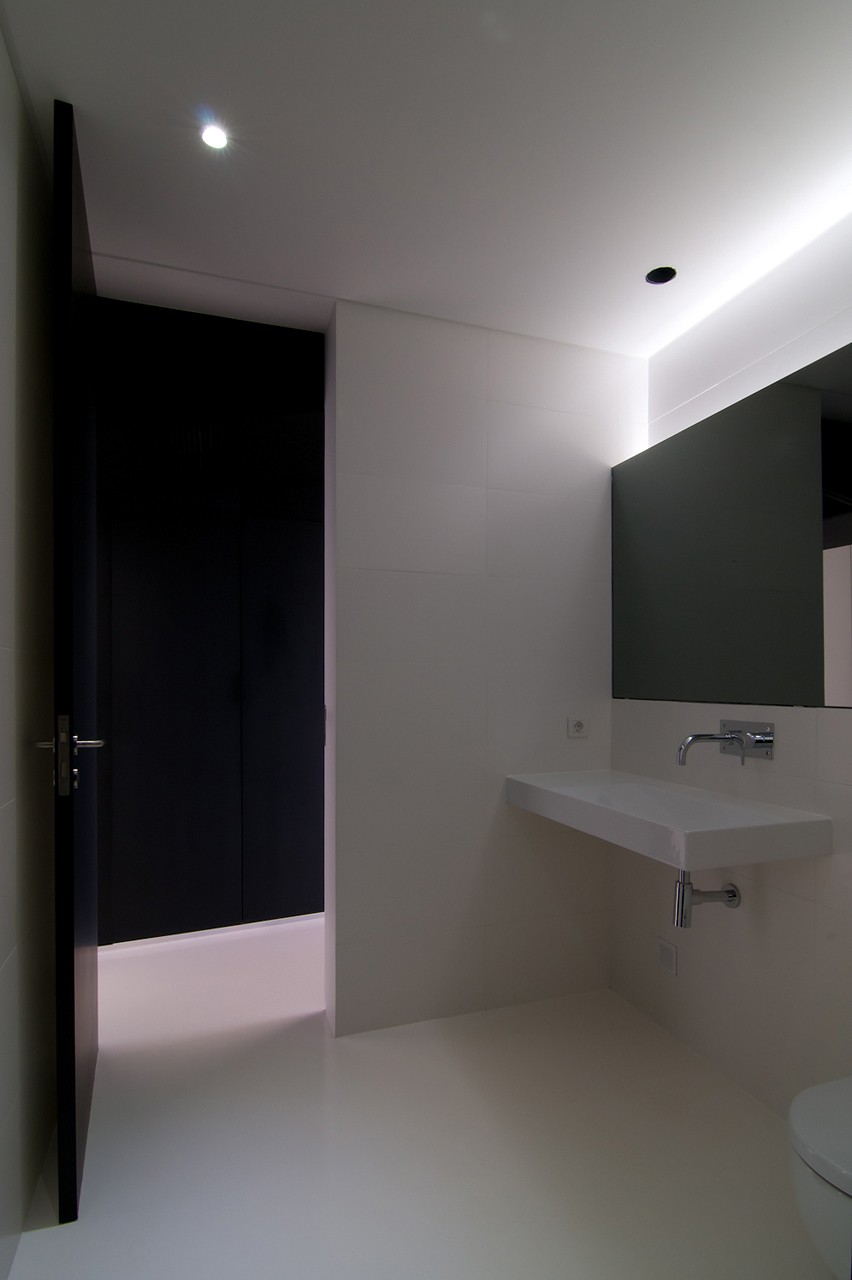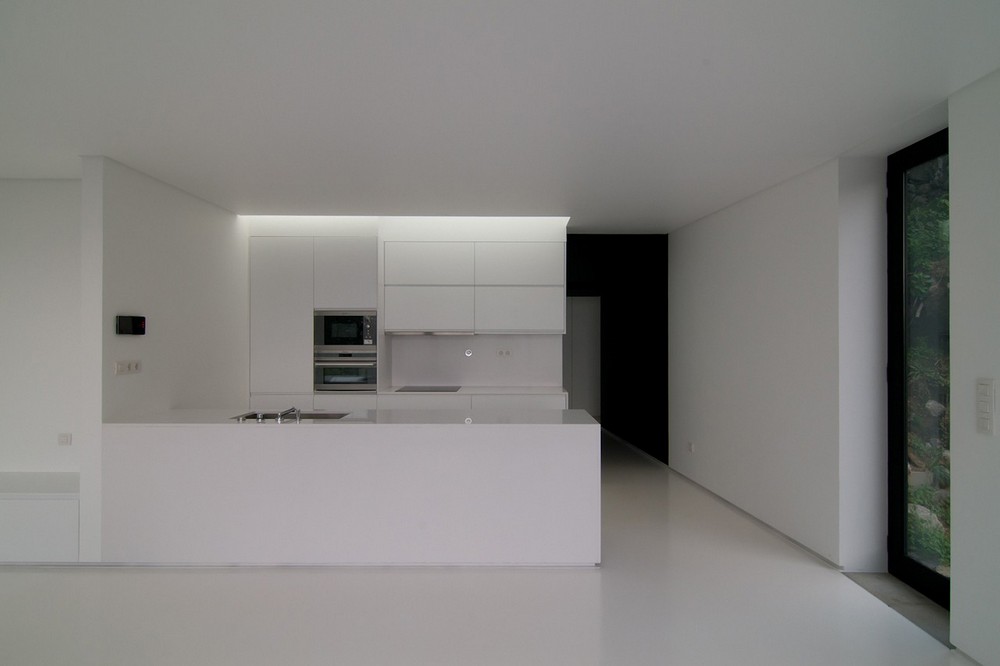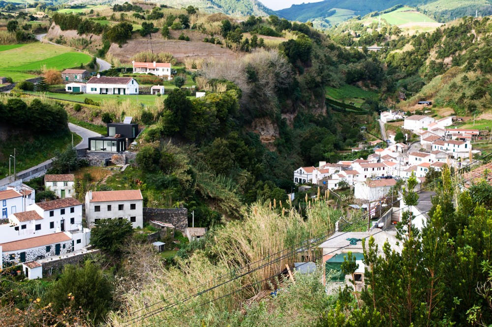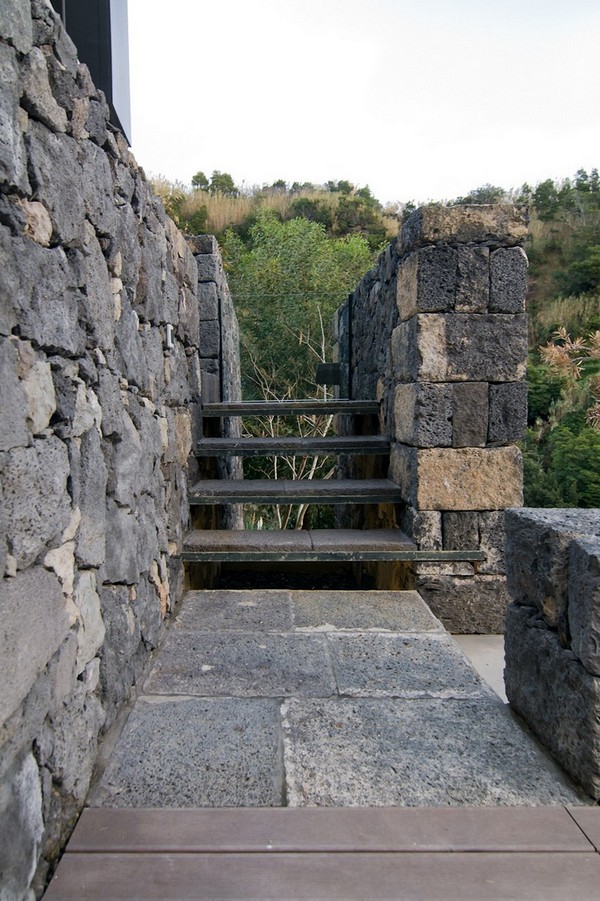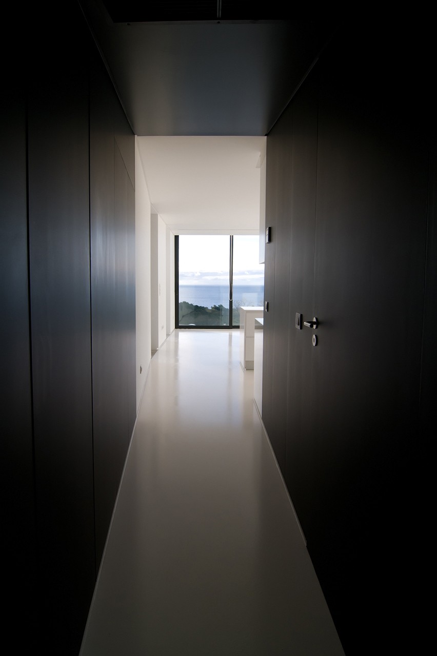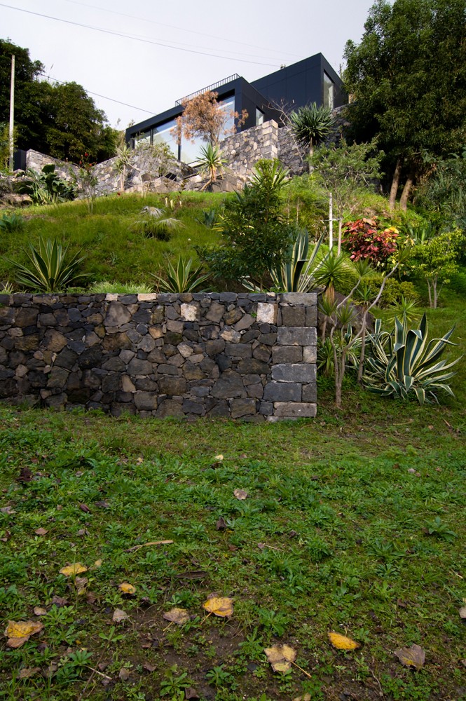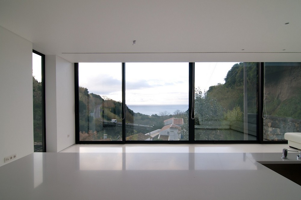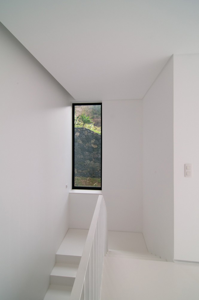 Zidurile existente din piatra si cele noi, sunt imbracate cu panouri negre ce contrasteaza puternic cu interioarele albe moderne, simple si minimalist rezolvate ce aduc viata si energie in spatiul casei. Casa este atent pozitionata pe teren oferind panorame catre ocean si valea Ribeira si in acelasi timp se relationeaza prietenos cu mediul natura.