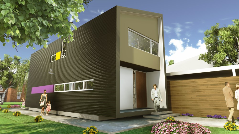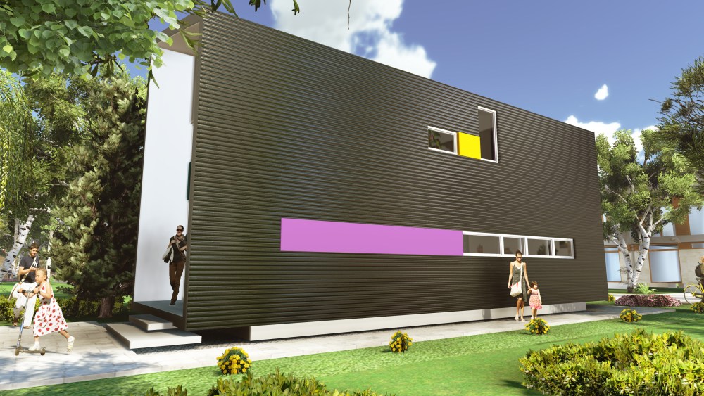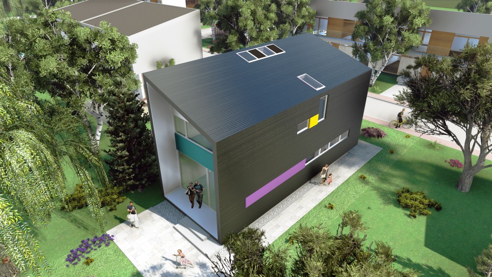 Aspectul exterior al casei se inscrie in cele mai noi tendinte ale arhitecturii contemporane. Acelasi material ( tabla sau lemn) va imbraca fatadele laterale si invelitoarea , ca intr-o coaja, laturile inguste ale constructiei primind un finisaj neutru, o tencuiala alba cu accente de culoare .