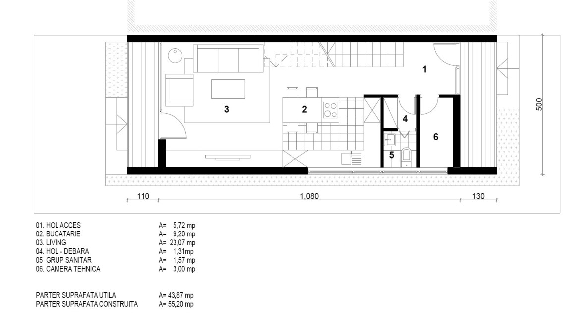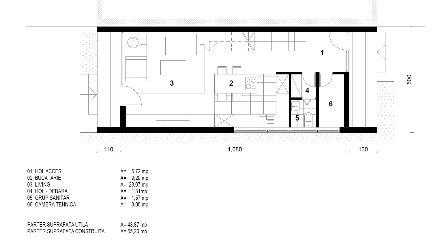 Se propune o locuinta cu doua niveluri care are o latime maxima de 5 m. La parter se gaseste zona de zi, cuprinzand vestibul , living, bucatarie, o camera tehnica, un grup sanitar si o mica depozitare, iar la etaj se regasesc doua dormitoare, o baie si o debara foarte incapatoare. Arhitectii s-au concentrate pe o rezolvare eficienta a instalatiilor, cu trasee cat mai scurte. Baia din etaj se suprapune peste grupul sanitar din parter, care la randul sau este intre bucatarie si spatiul tehnic. In plus, spatiile vor putea beneficia de o buna ventilatie naturala datorita conformatiei planului. Structura simpla, cu etaj mansardat reprezinta un alt avantaj care se va reflecta in costul de construire .