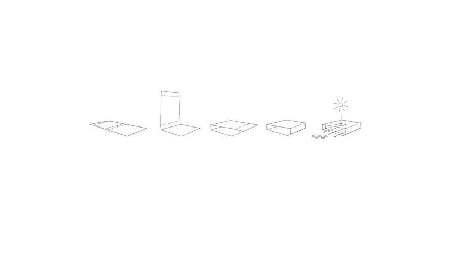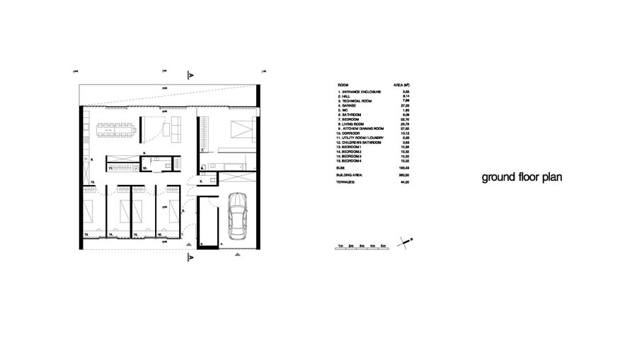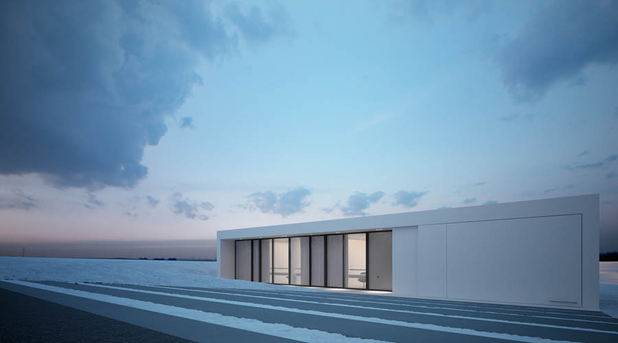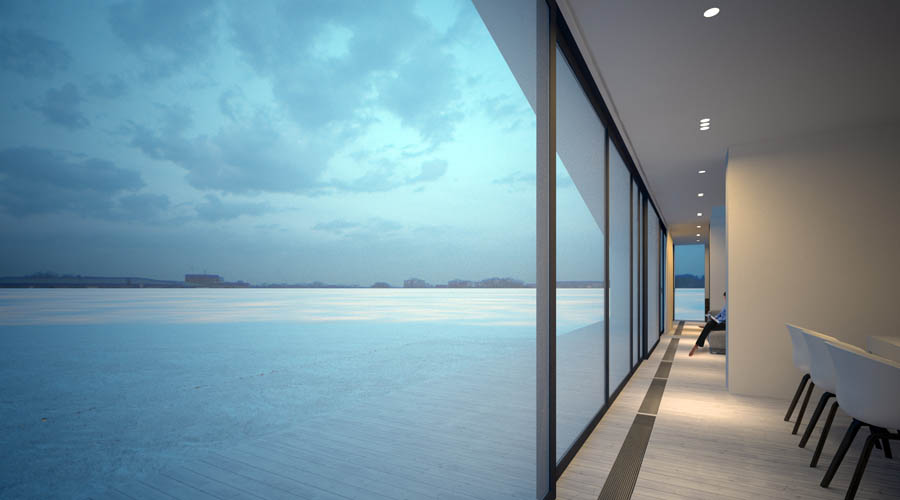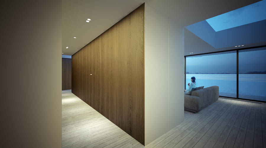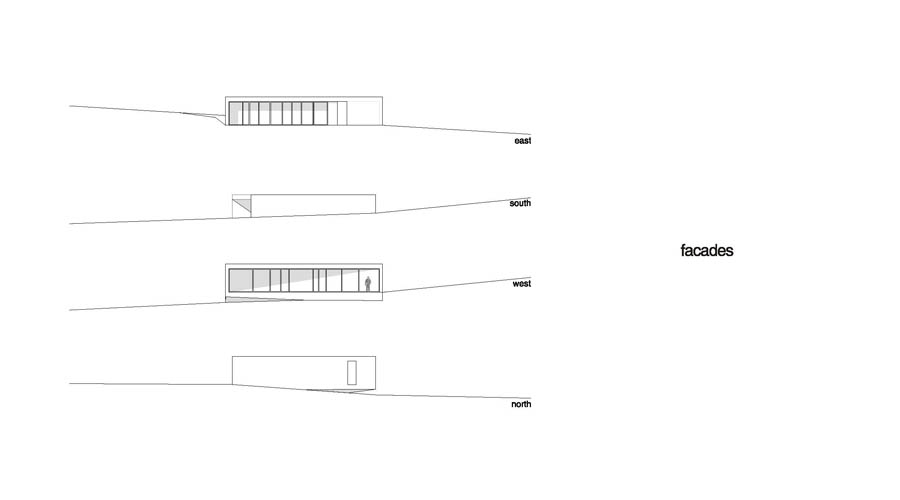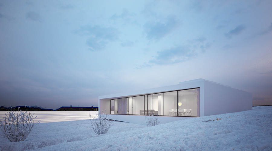 Ideea principala a proiectului a fost ca suprafata terasei sa para ca e in continuarea peisajului. Pentru a intarii aceasta idee cele doua laturi vitrate se pot deschide astfel spatiu exterior intra si comunica cu cel interior. In timp ce exteriorul este simplu alb, la interior pe langa suprafetele albe apare si lemnul, esenta de mesteacan. Planul imparte casa in 4 zone principale – zona garajului, zona dormitorului matrimonial, zona pentru copii si zona livingului.