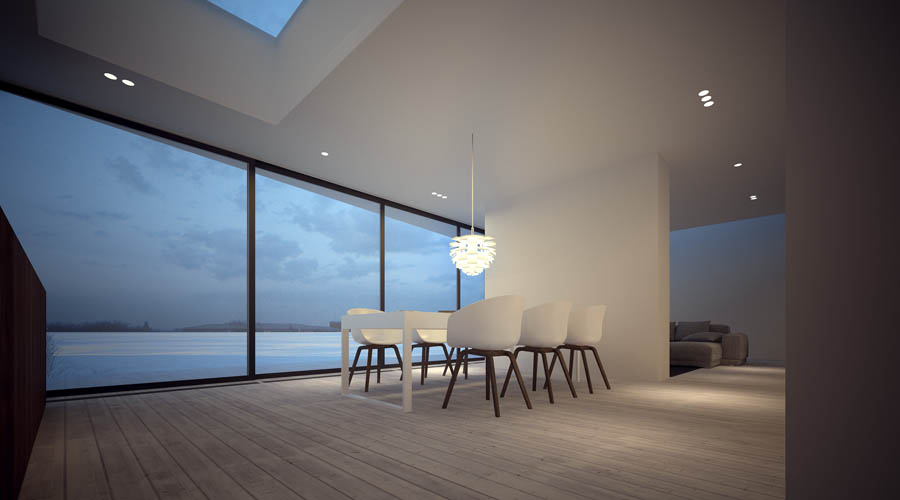 Zona livingului este scaldata in lumina naturala datorita zonelor vitrate din pereti , dar si celor doua luminatoare uriase care dau impresia ca acest spatiu este stabilit in peisaj, nu in interiorul casei.