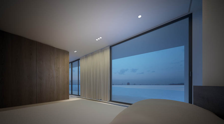 Dormitorul matrimonial are un pat dublu si o garderoba generoasa. Baia este amplasata in spatele peretelui de sticla si este echipata cu o cada, cabina de dus, chiuveta si toaleta; ultimele doua sunt ascunse in spatele garderobei pentru a nu fi vizibile din dormitor. Beneficiarii se pot bucura de vederea uimitoare spre exterior in timp ce se relaxeaza in baie. O fereastra suplimentara in dormitor aduce mai mult lumina si face de asemenea legatura cu peisajul exterior.