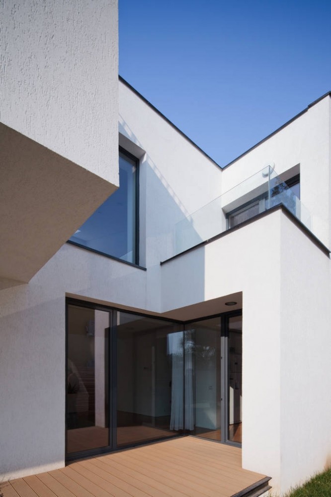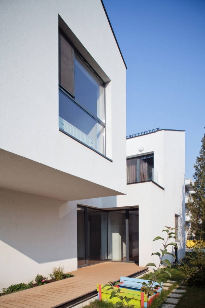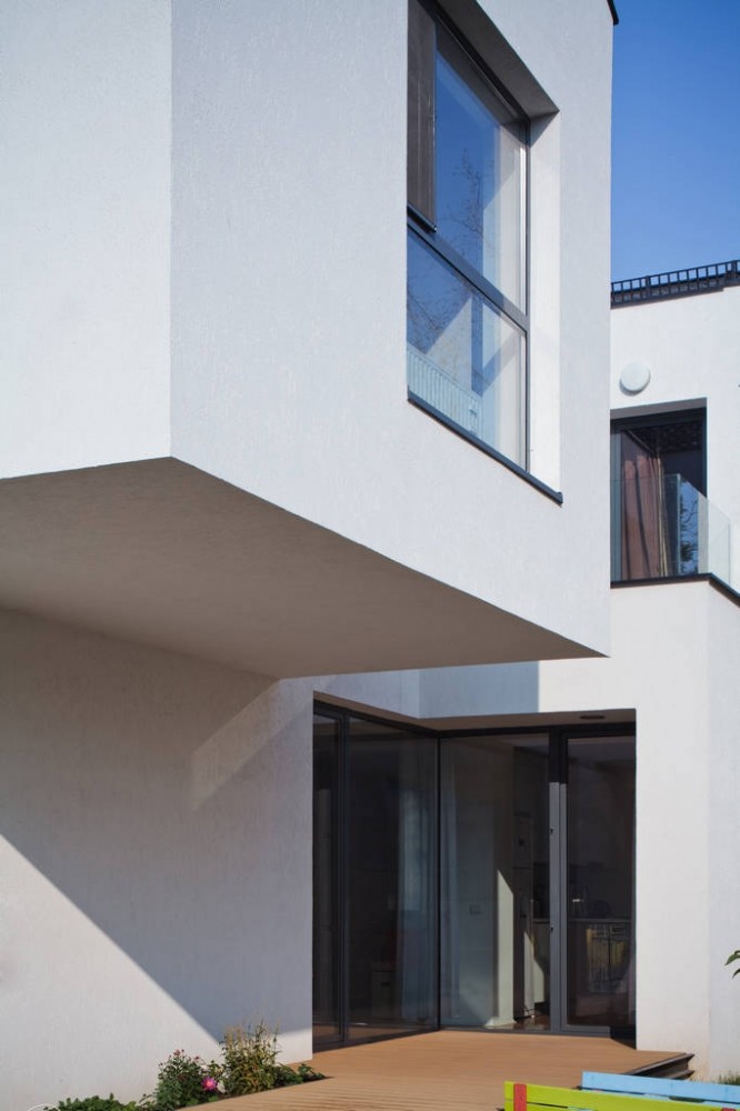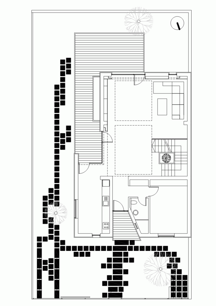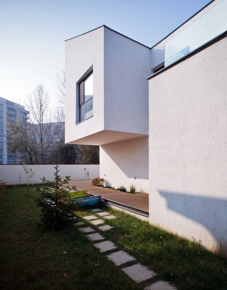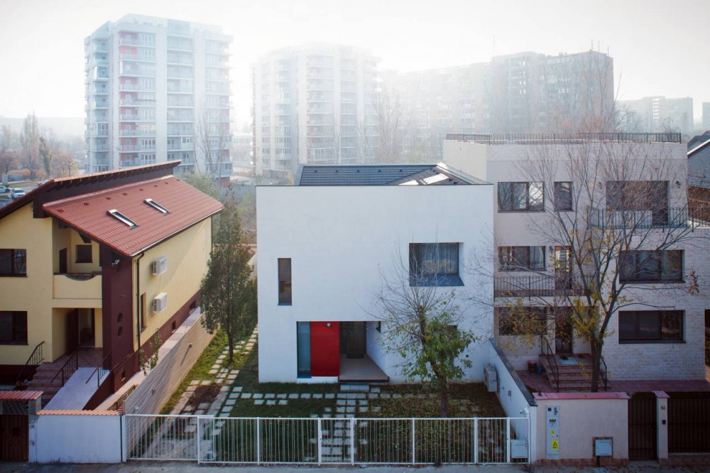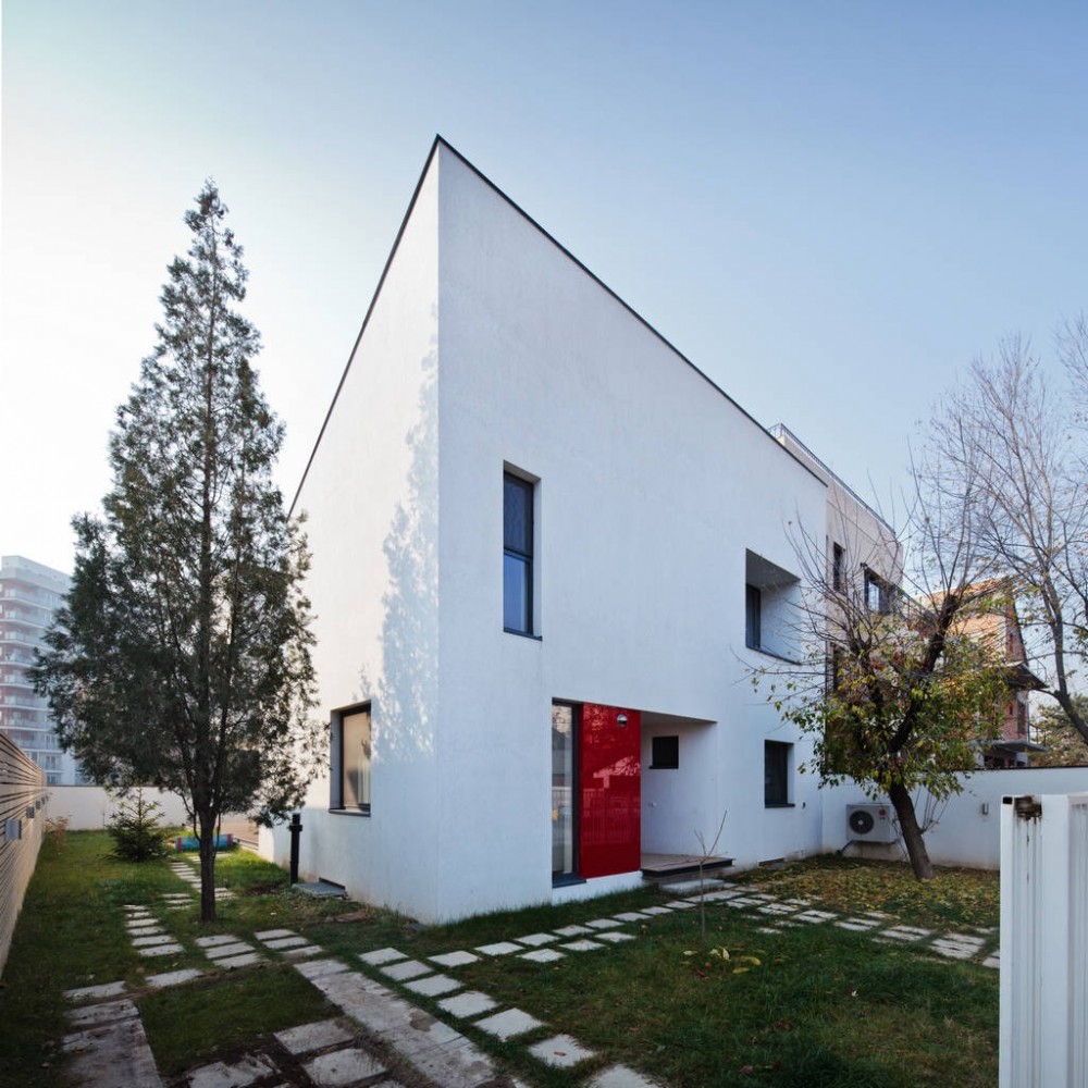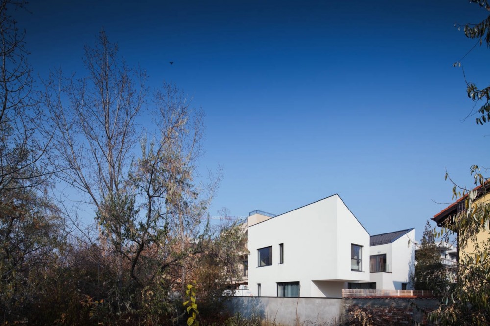 Arborii pastrati au determinat amplasarea casei pe teren fiind elemente de conditionare similare cu conditionarile de urbanism.Conform planului de urbanism se putea construi o casa cuplata la calcan pe latura de est. Impletind dorinta beneficiarului de a avea o sarpanta cu invelitoare de tigla si ideea de a avea o volumetric cu linii moderne, a condus la organizarea acoperisului in trei pante care se aduna spre interior, spre o zona ingusta cu jgheab ascuns. Aceasta solutie a multumit pe toata lumea si a creat in acelasi timp spatii generoase si spectaculoase in etaj unde tavanul interior a urmarit pantele acoperisului.